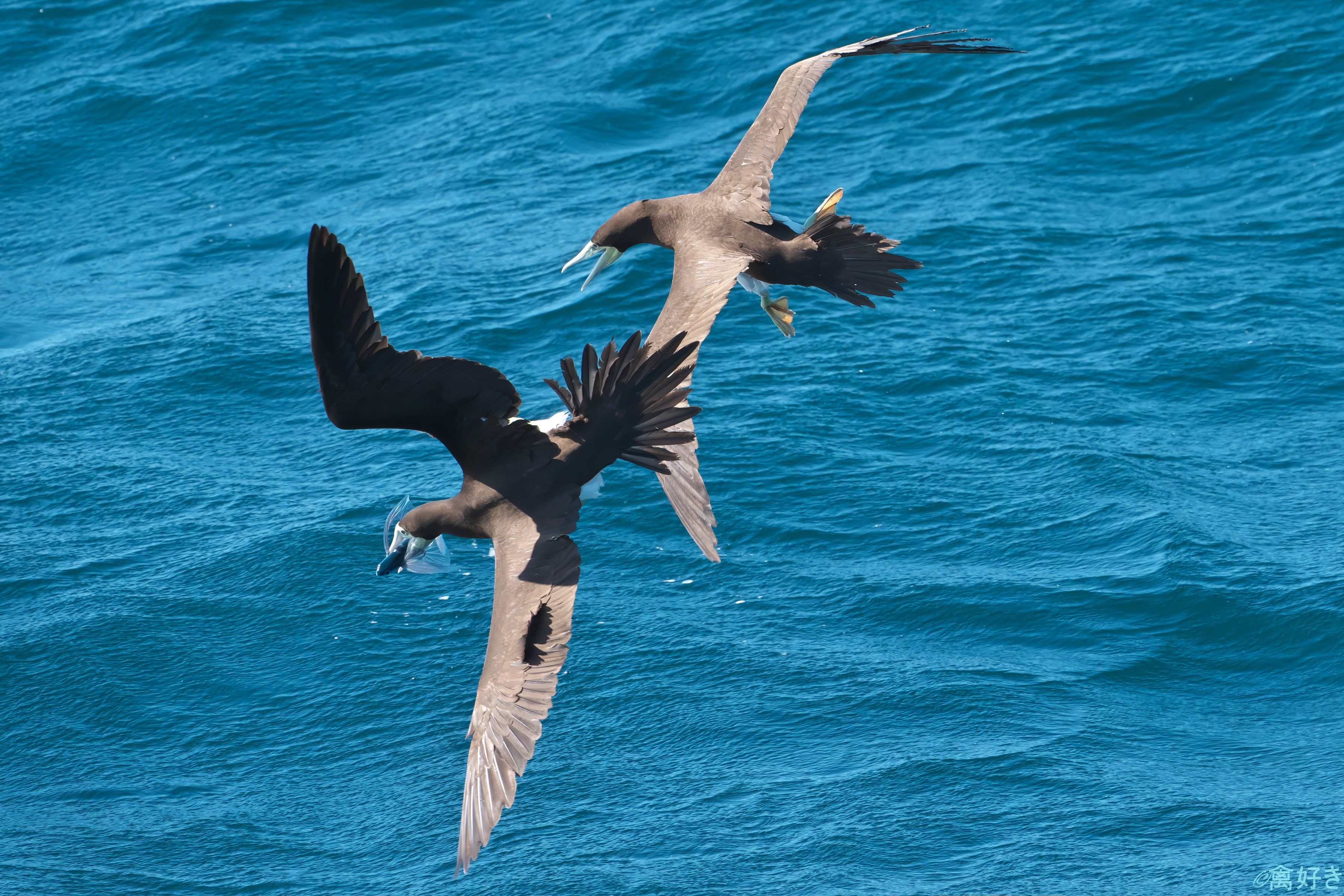 離島航路の船上から 船に驚いて水面を飛行するトビウオを捕まえる、カツオドリ。 それを、別の鳥が横取りしようとしています。