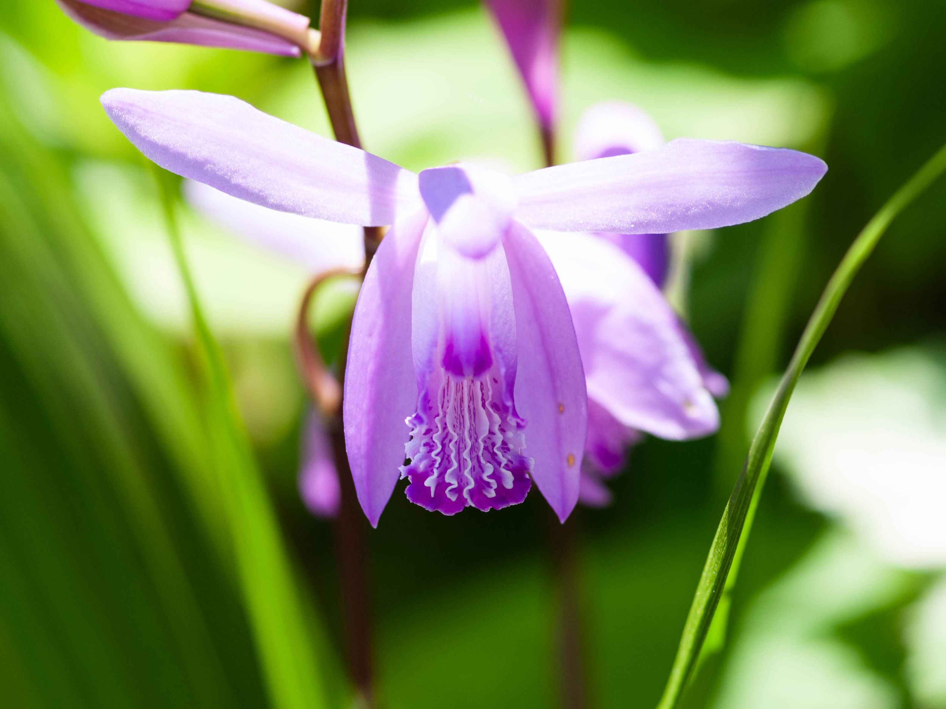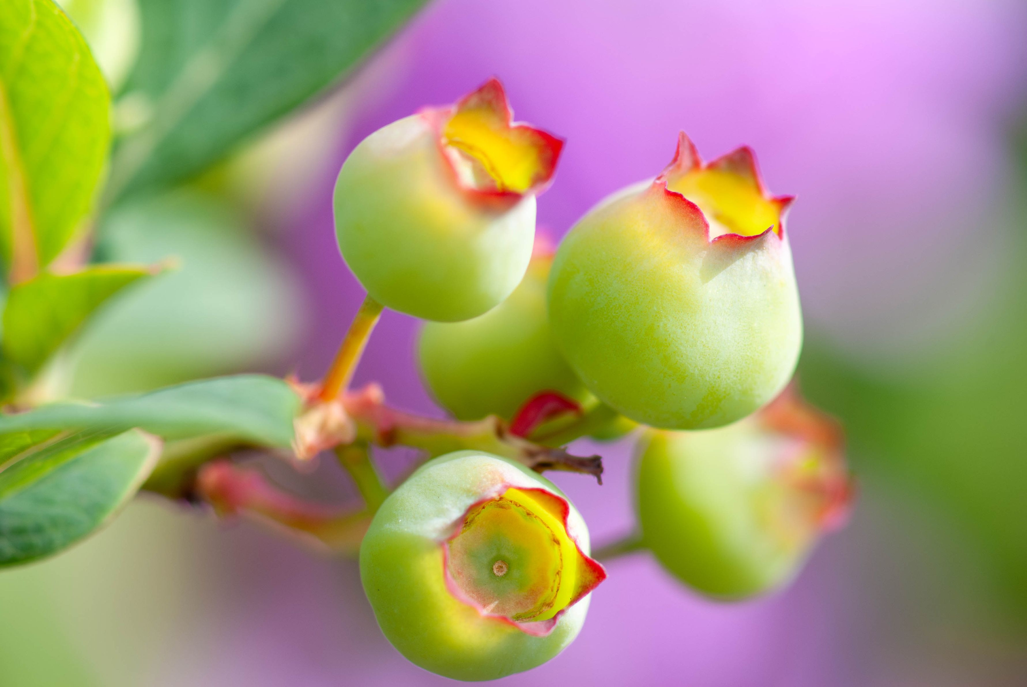 ブルーベリーの実が膨らみ始めた。初々しい。熟すと孫が摘んで食べる姿が楽しみ。背景のピンクは後ろに咲いていたシランの色。自動補正後、露出を少し上げた。