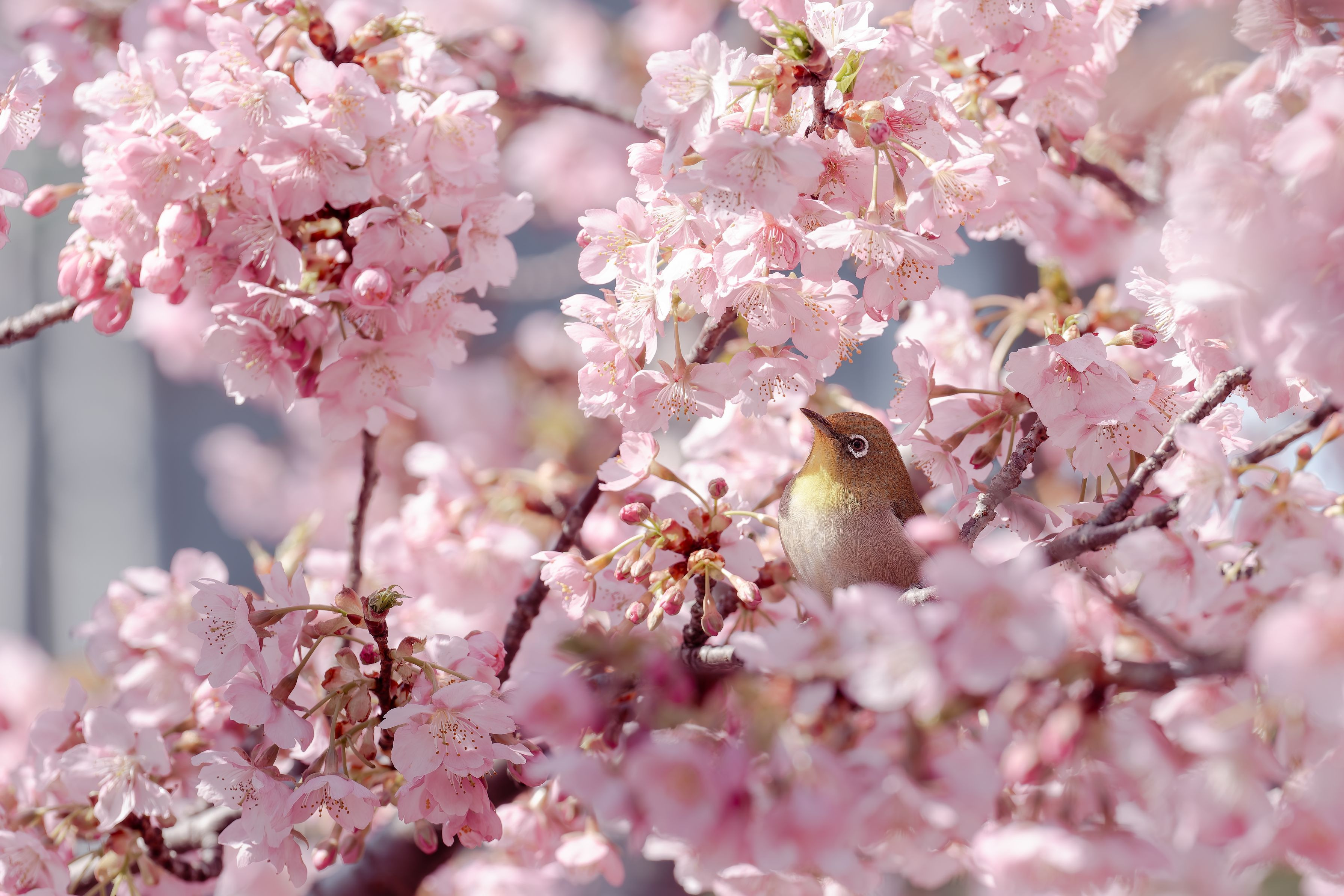 河津桜の咲く晴れた日に、メジロが花の隙間から空を見上げていました。背景の光と色を整え、春の空気感を意識して仕上げました。 #フラワー2025# #メジロ#
