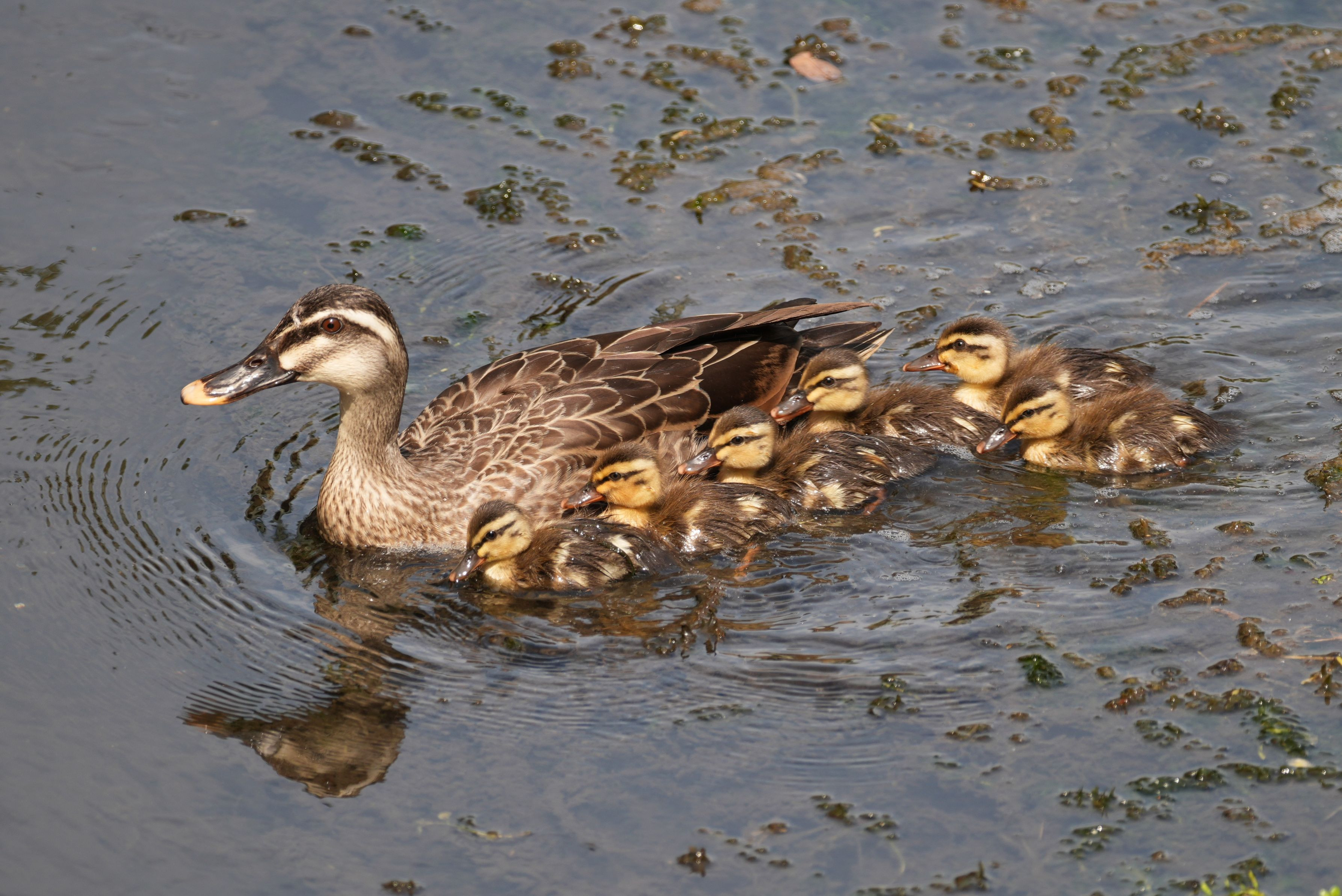 この時期、定番のカルガモ親子です。雛はまだ小さいので、カラスや猫に襲われぬよう気をつけながら、みんな元気に育ってほしいですね。