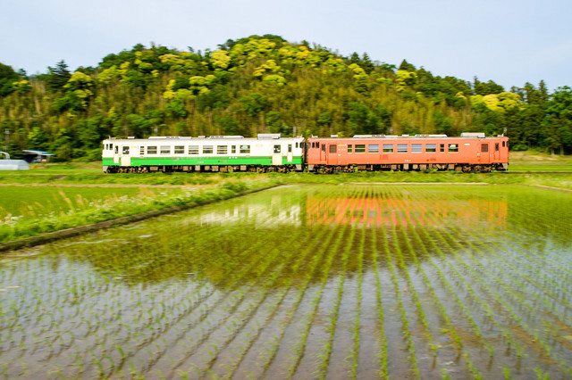 水を張った田に新緑が映える小湊鉄道の春