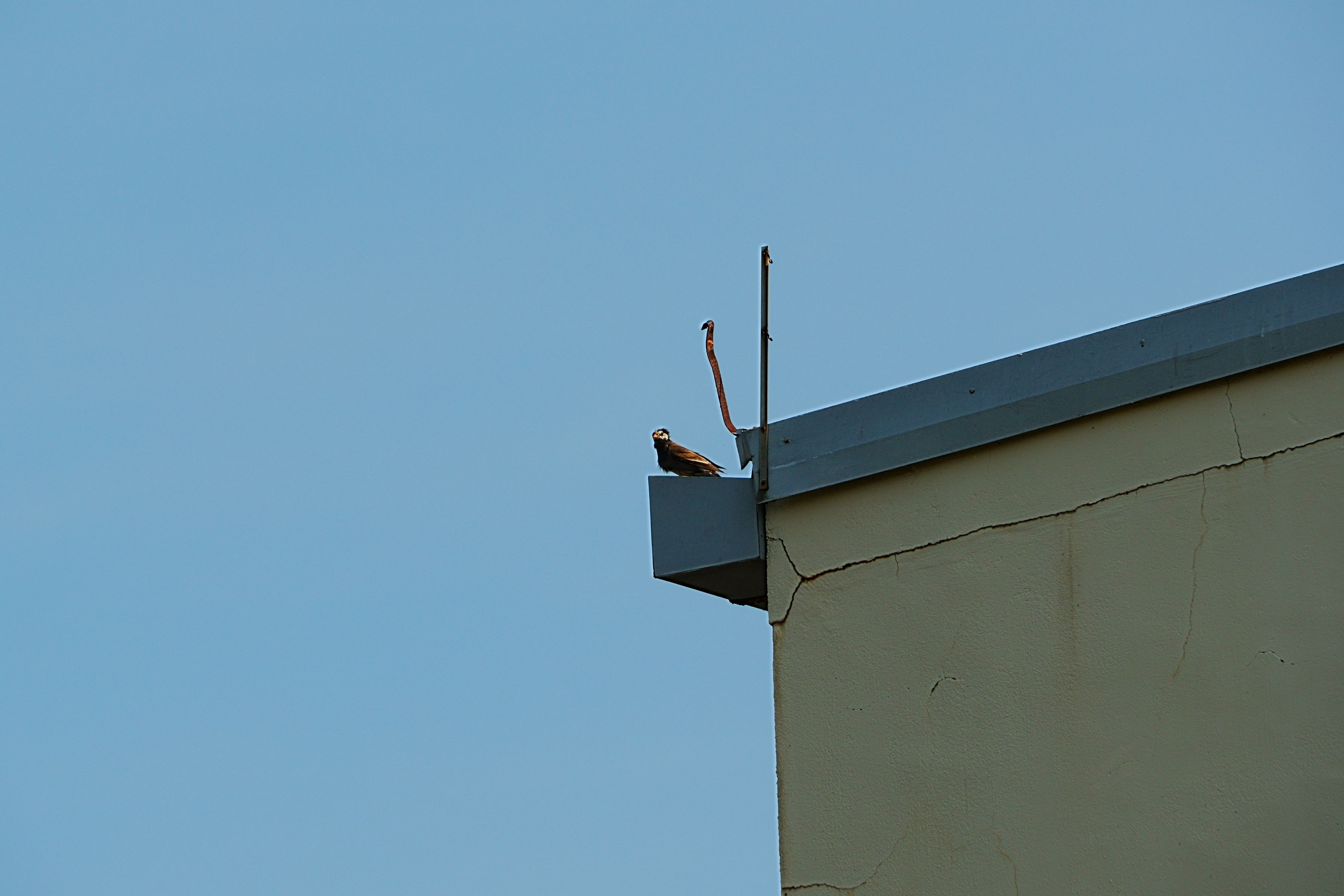 遠くの工場の屋根に、何か棒が3本立っていると思ったら、鳥さんでした( ^ω^ ) 風の強い日で、拡大してみると羽がモシャモシャになっていて可愛かったです。