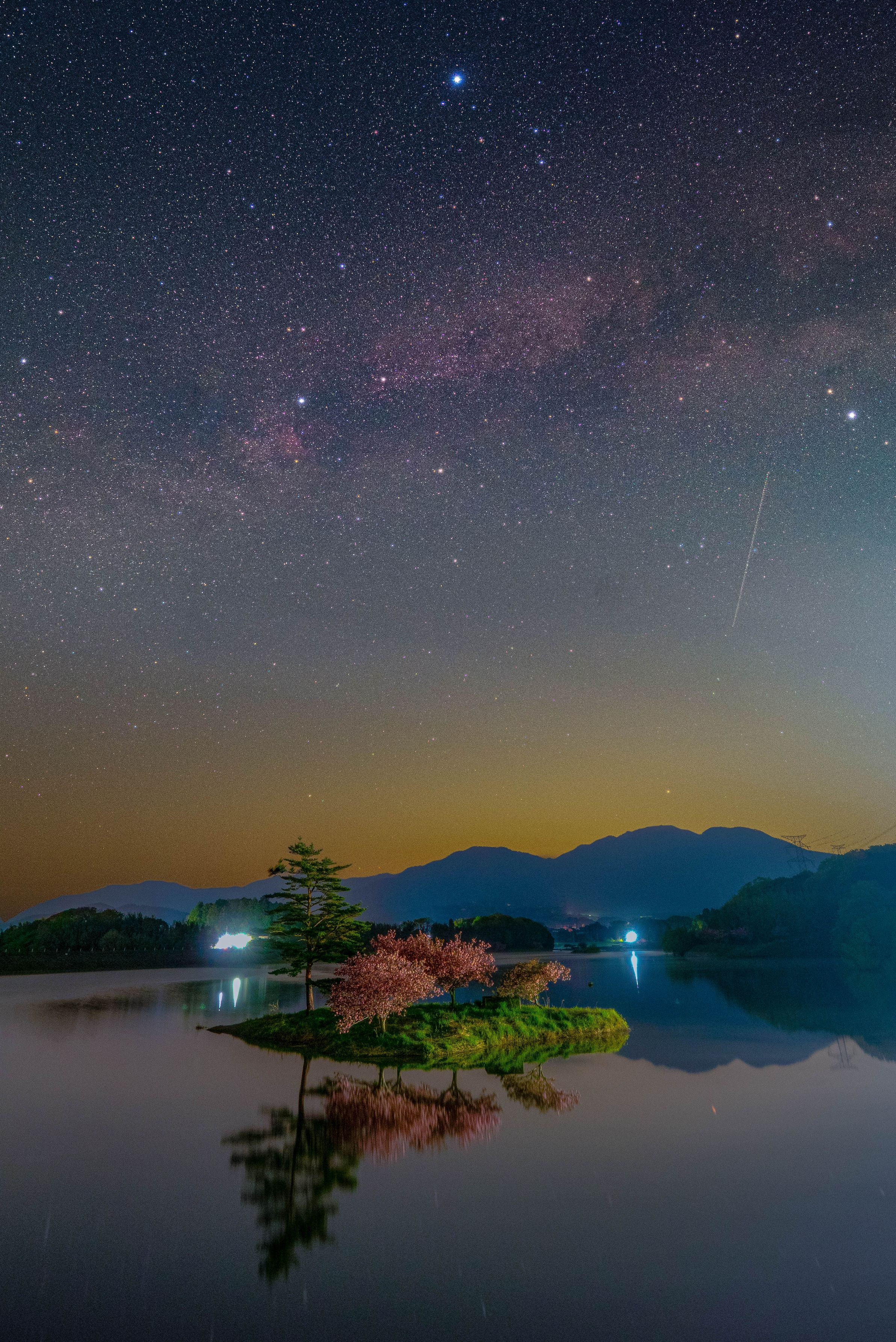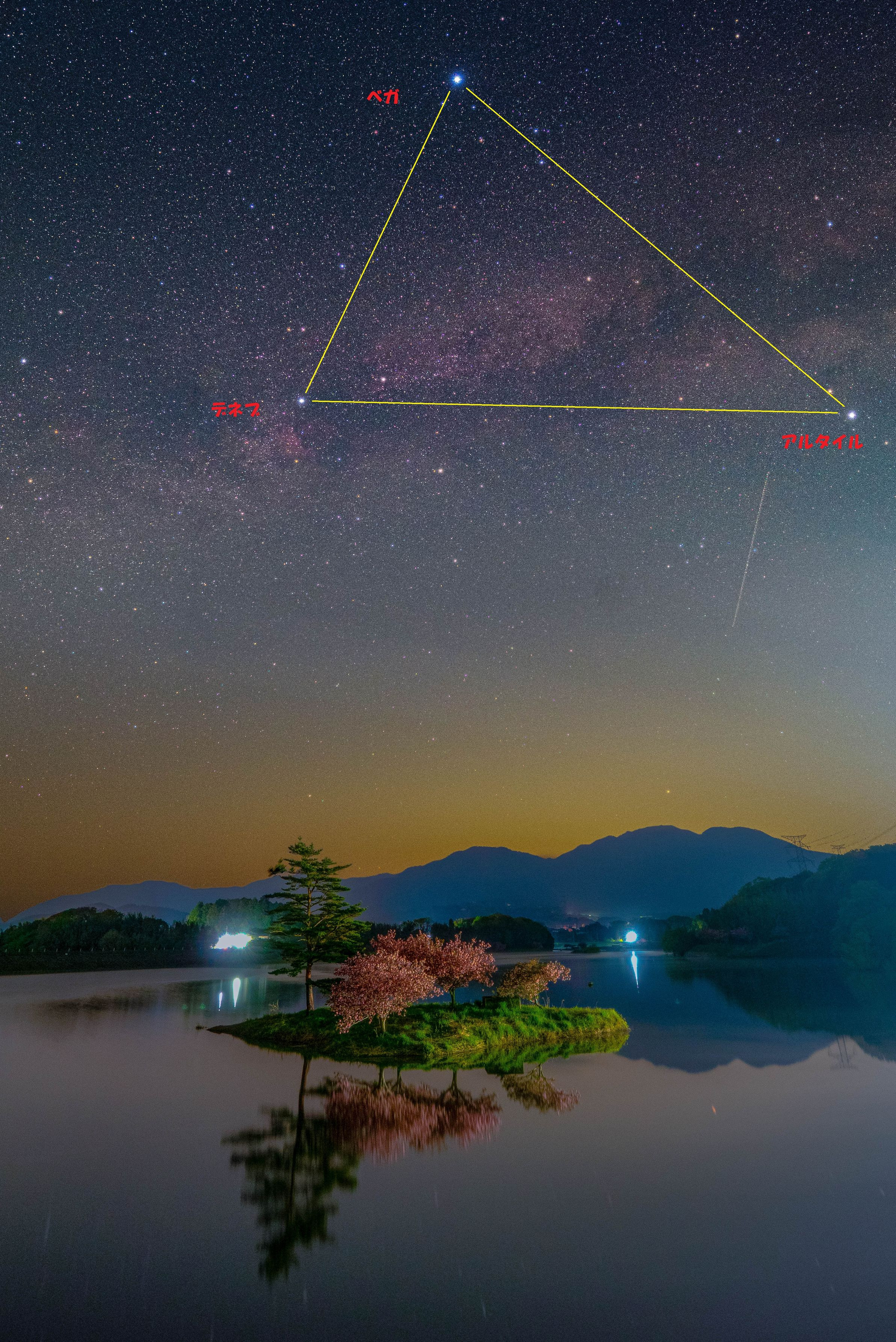夜明け前、春の浮島の八重桜と昇ってきた夏の大三角形の競演を撮影してみました!(^◇^) ※リアにソフトフィルターをつけた14GMで撮影し21mm相当にクロップしました。