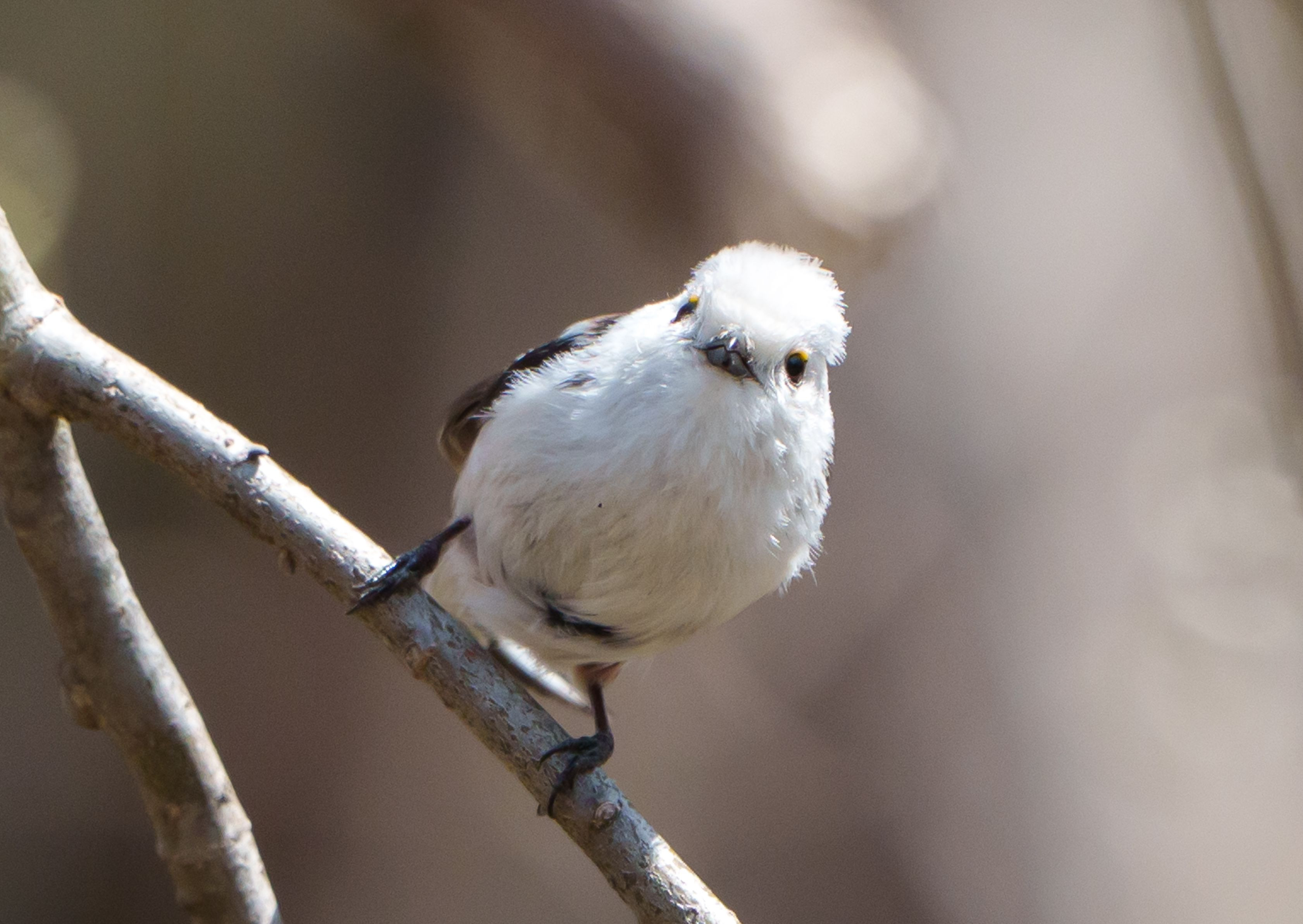 春になり、シマエナガさんの特徴でもある白くてまん丸なボディーが、夏に向けてシュッとスリムになってきています。そのせいなのか、ふわふわが残る頭の毛がパイナップルのようなヘアスタイルになっていました。