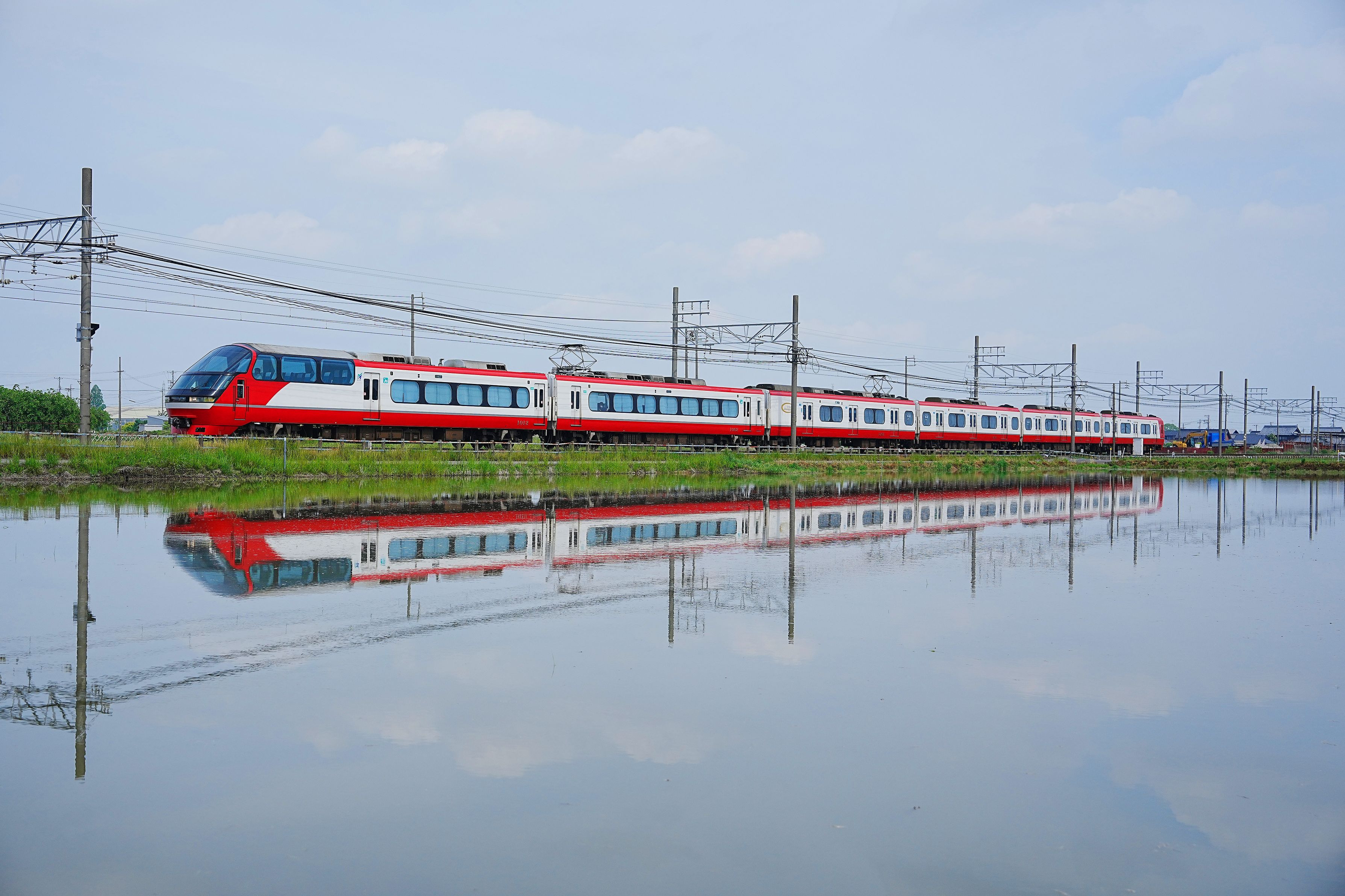 田植えの水が入った大きな田んぼに姿を写し走る特急