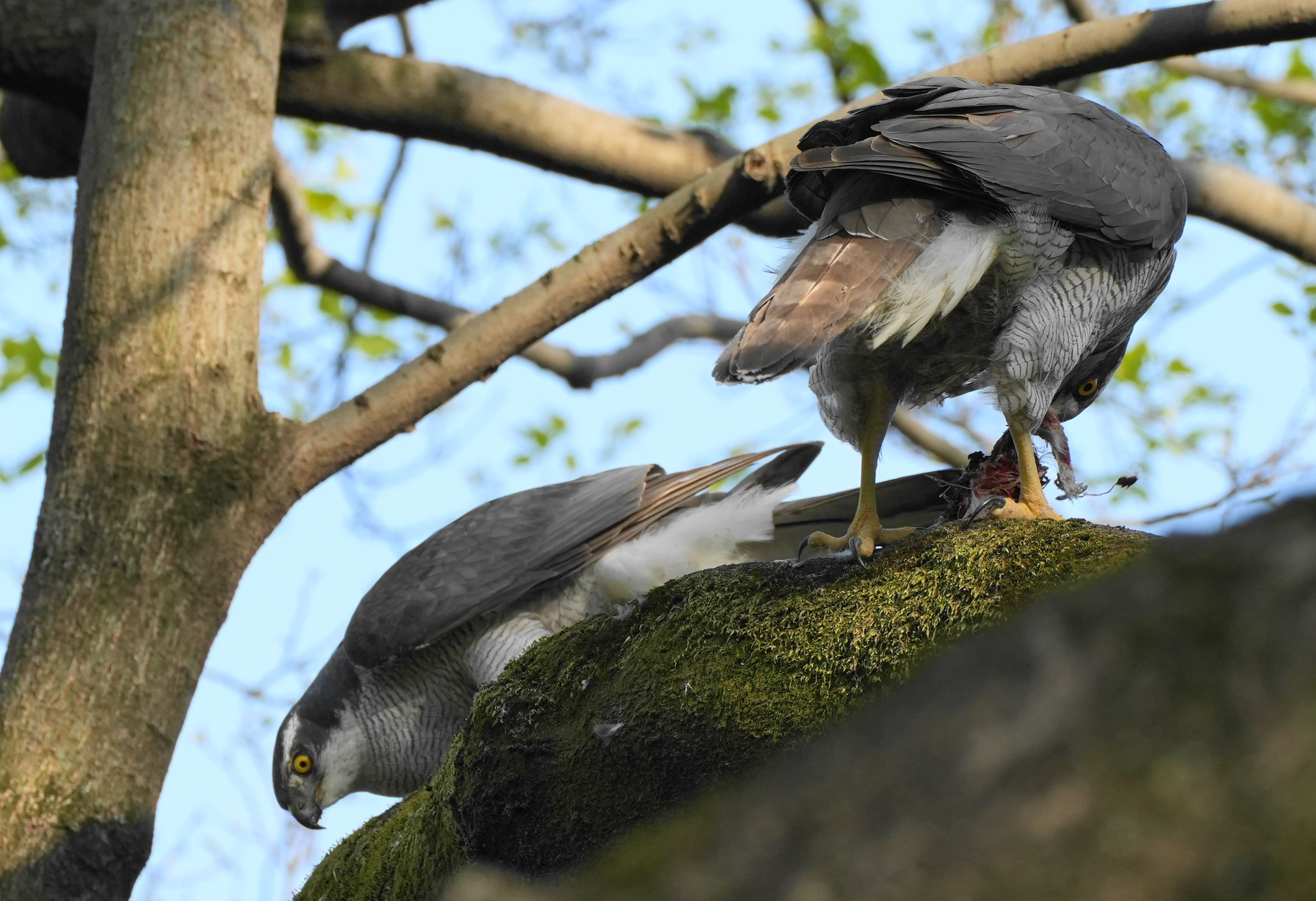オオタカの雄が運んできた餌を雌が受け取った瞬間を撮ったつもりでしたが 少しタイミングが遅かった、残念です。 雄はサッサと飛び去りました。