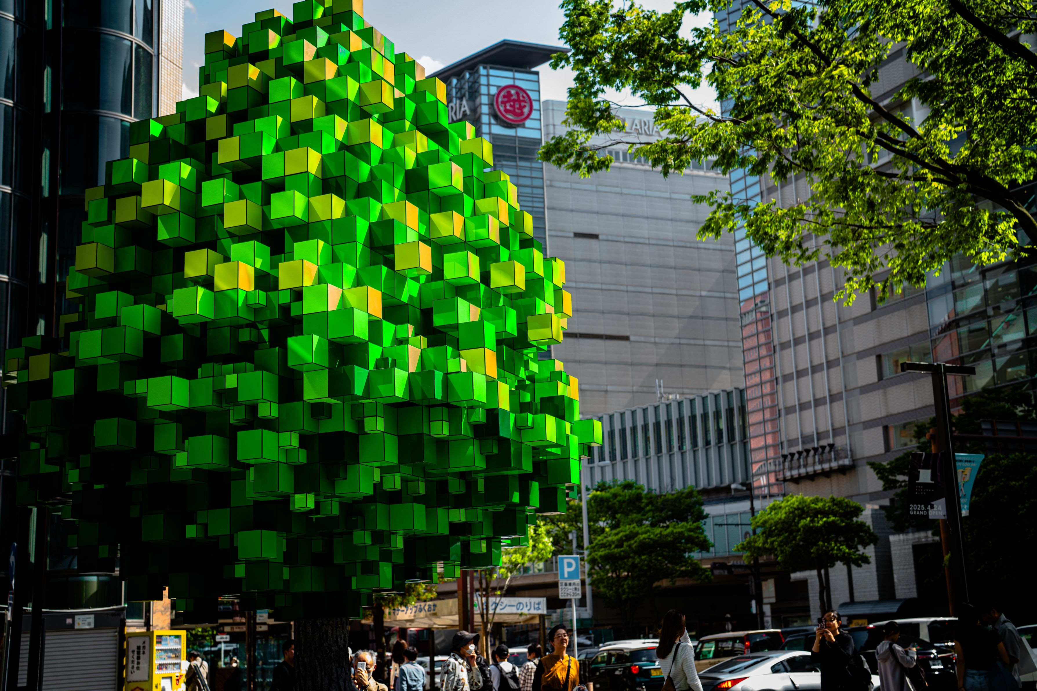 福岡天神に新しくできたフクオカワンビル その側にあるピクセルツリーを撮影しました。 いずれ「マイクラの木で待ち合わせ」みたいな新しい待ち合わせ場所になるんですかね