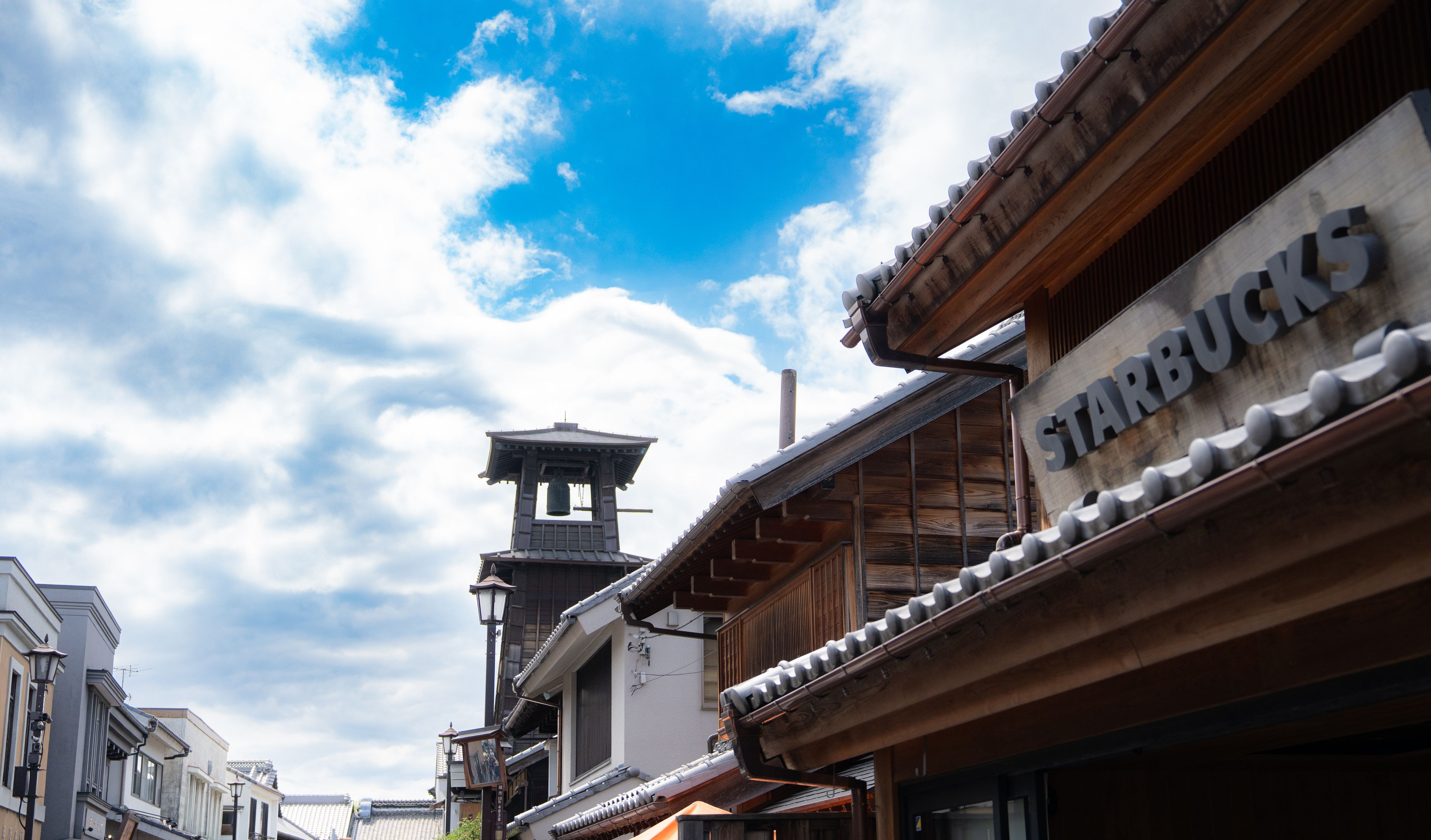 川越小江戸のスターバックス。街並みにうまく溶け込んでいました。スタバと時の鐘を一緒に
