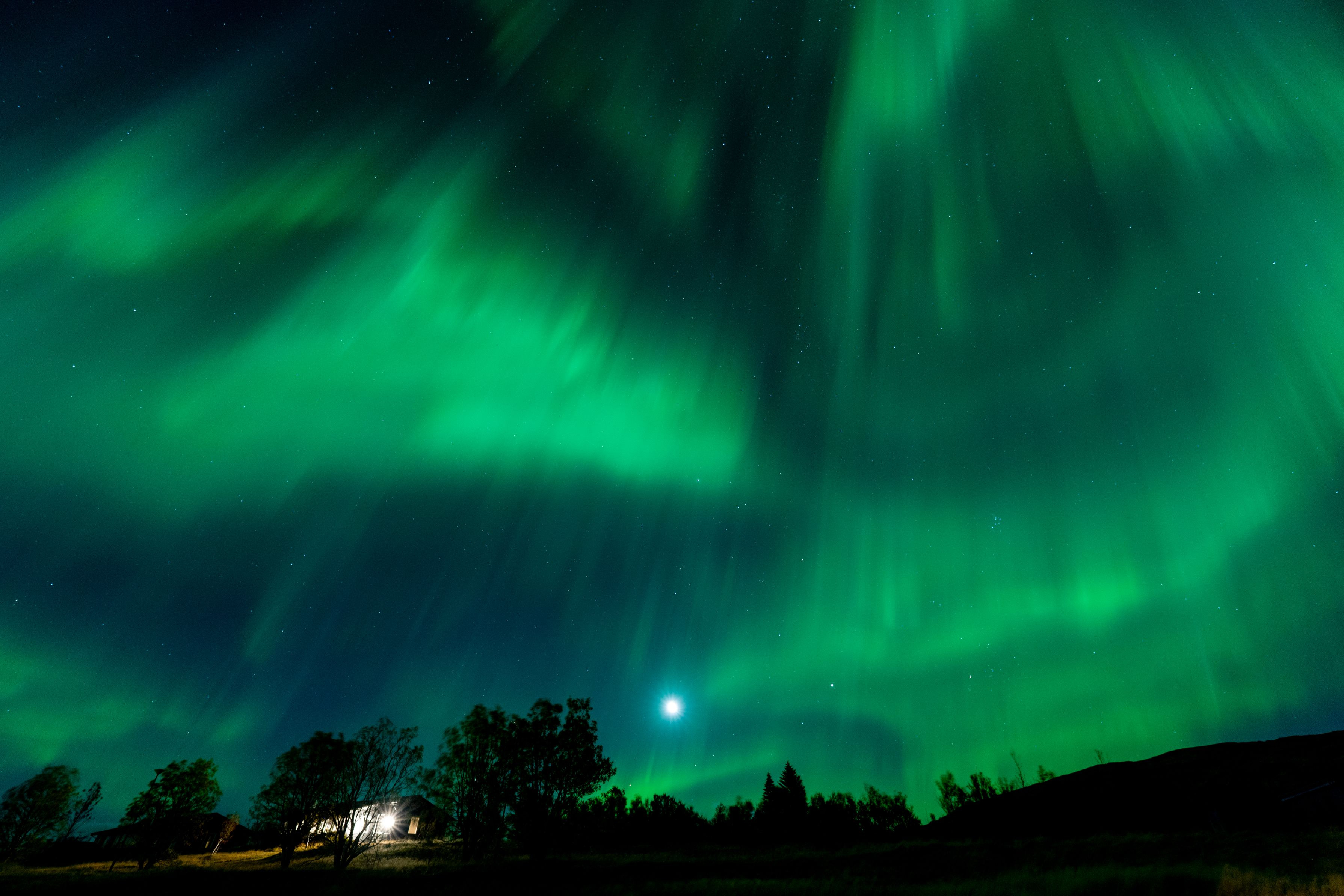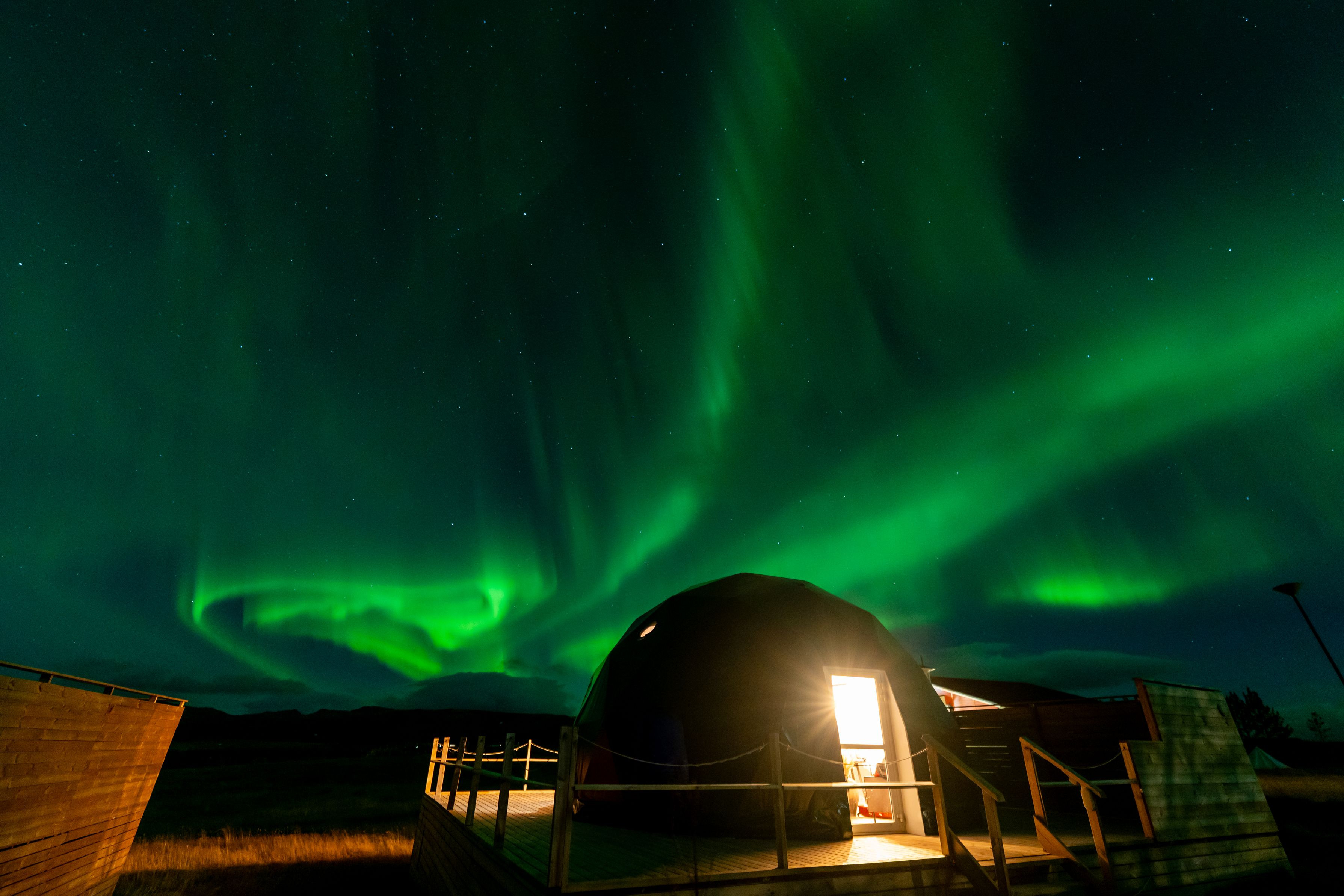 アイスランドのゴールデンサークルを訪れた際に撮影したものです。 この日は曇っていた上にオーロラ予報を見ても遭遇率はかなり低いとされていたので あきらめてコテージでゆっくりしていました。 そんな中、ストーブの薪が切れそうだったので外に薪を探しに出たところいつの間にか 空にオーロラが広がっており、急いで撮影を行いました^^
