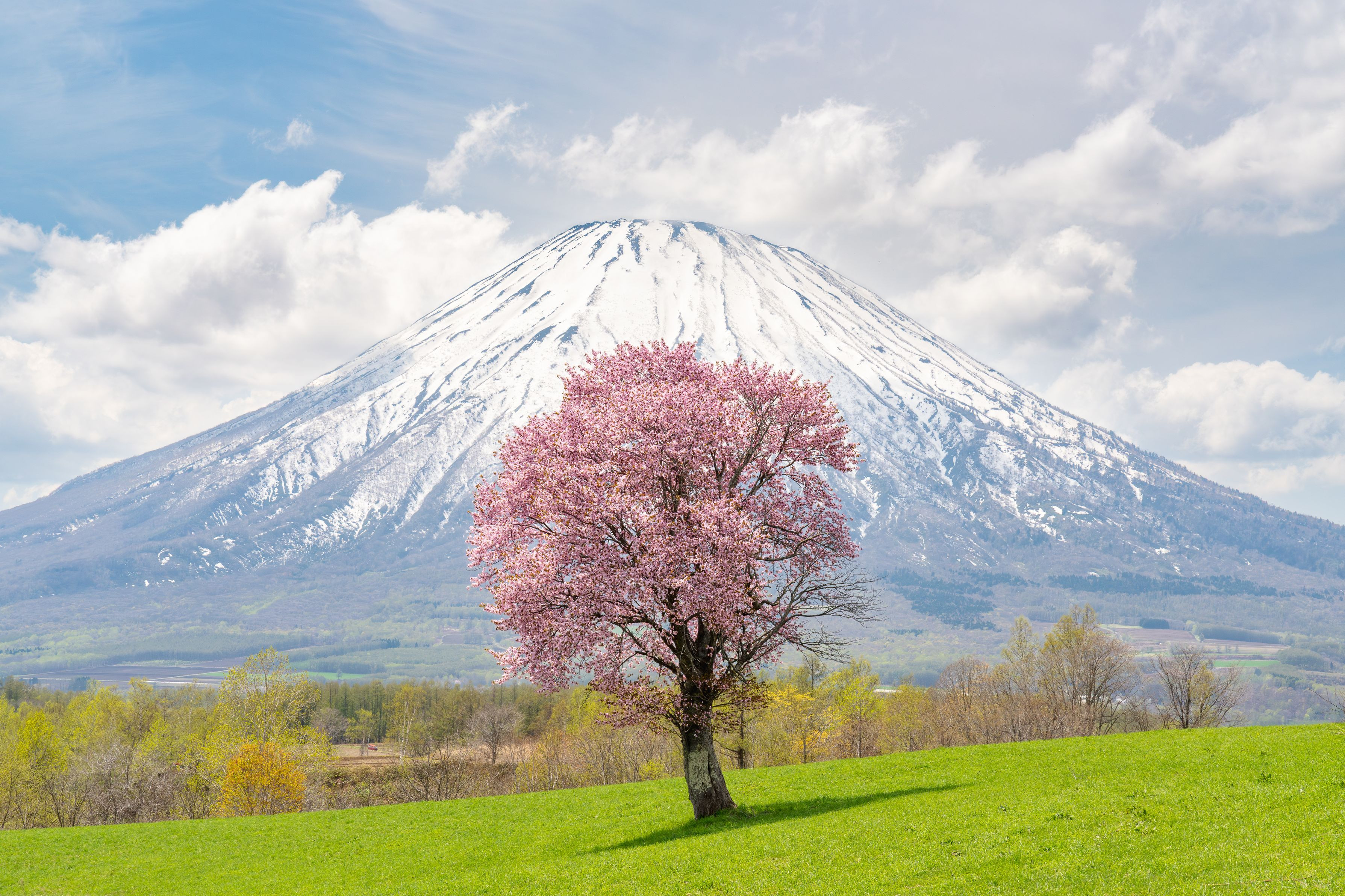 待ちわびてようやく満開の一本桜、北海道京極町の一本桜と羊蹄山です。