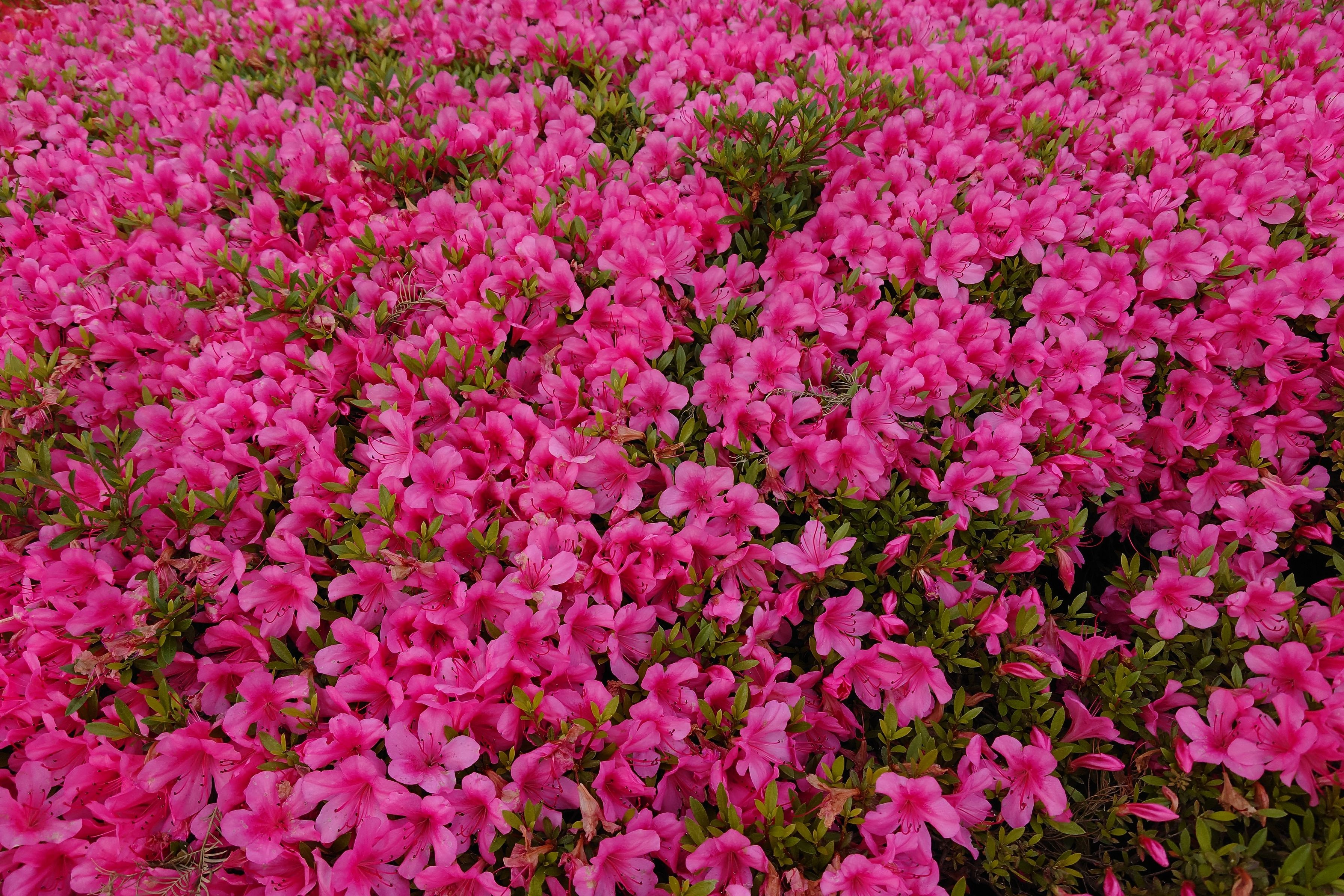 ツツジが終わり、サツキ(たぶん)がデラックスに咲いています。 葉の大きさが、ツツジに比べて小さいですね。 花の大きさも、ツツジに比べて少し小さい感じ。