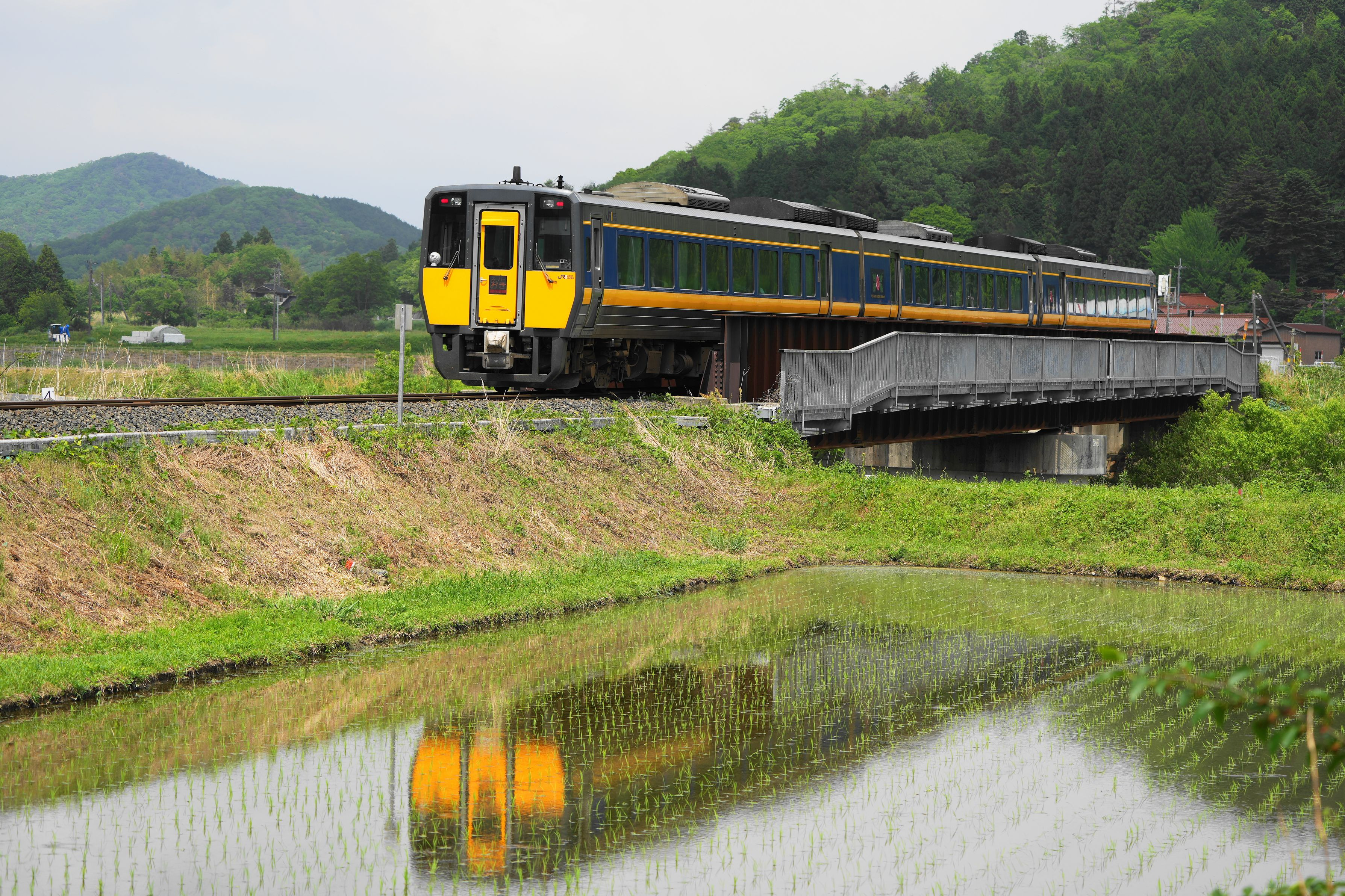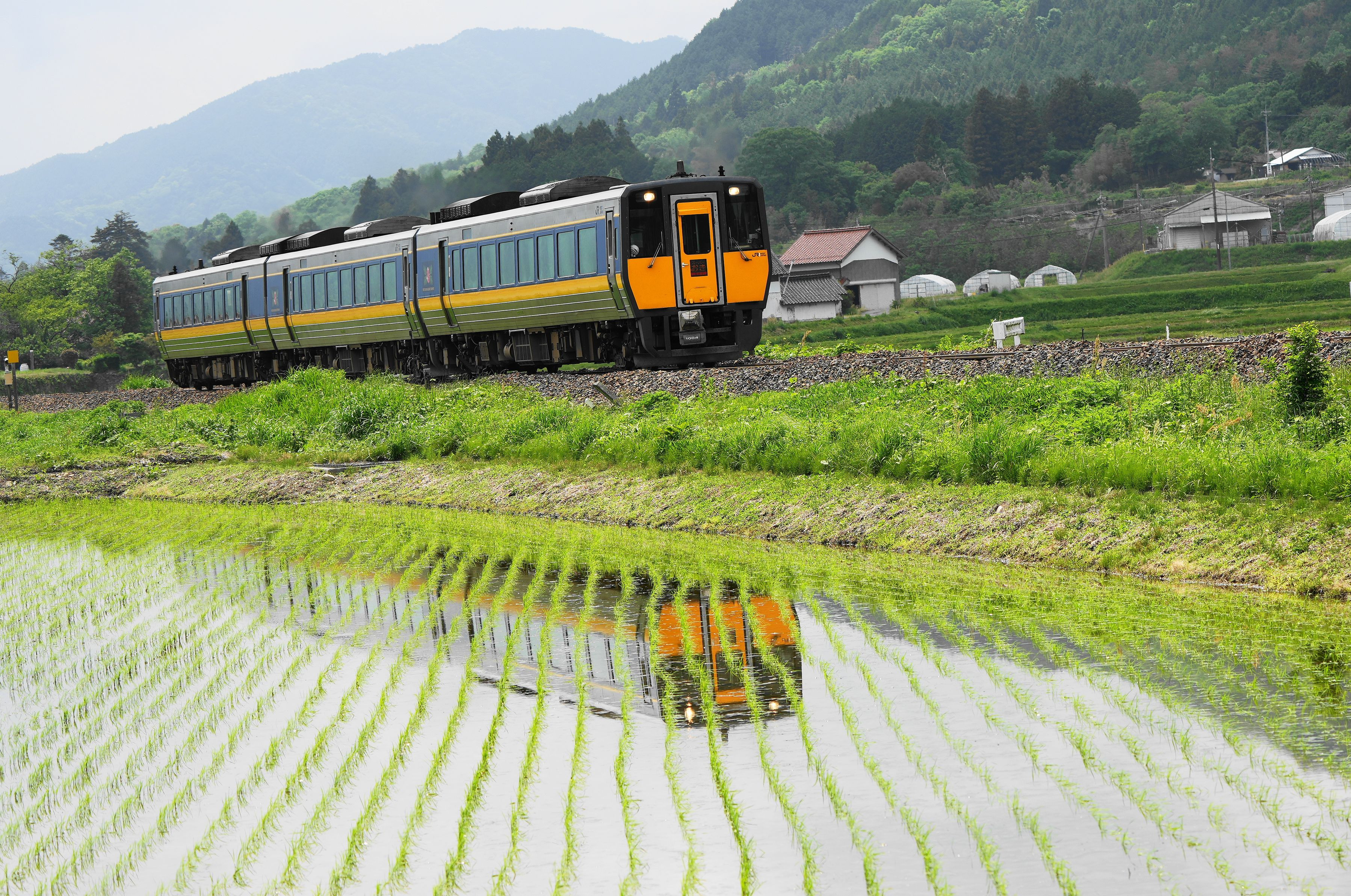 山口線沿いの早苗田に映る[スーパーおき] 元気に育ってほしいコメ事情。 山口線もコメも頑張ってほしいご時世ですね。
