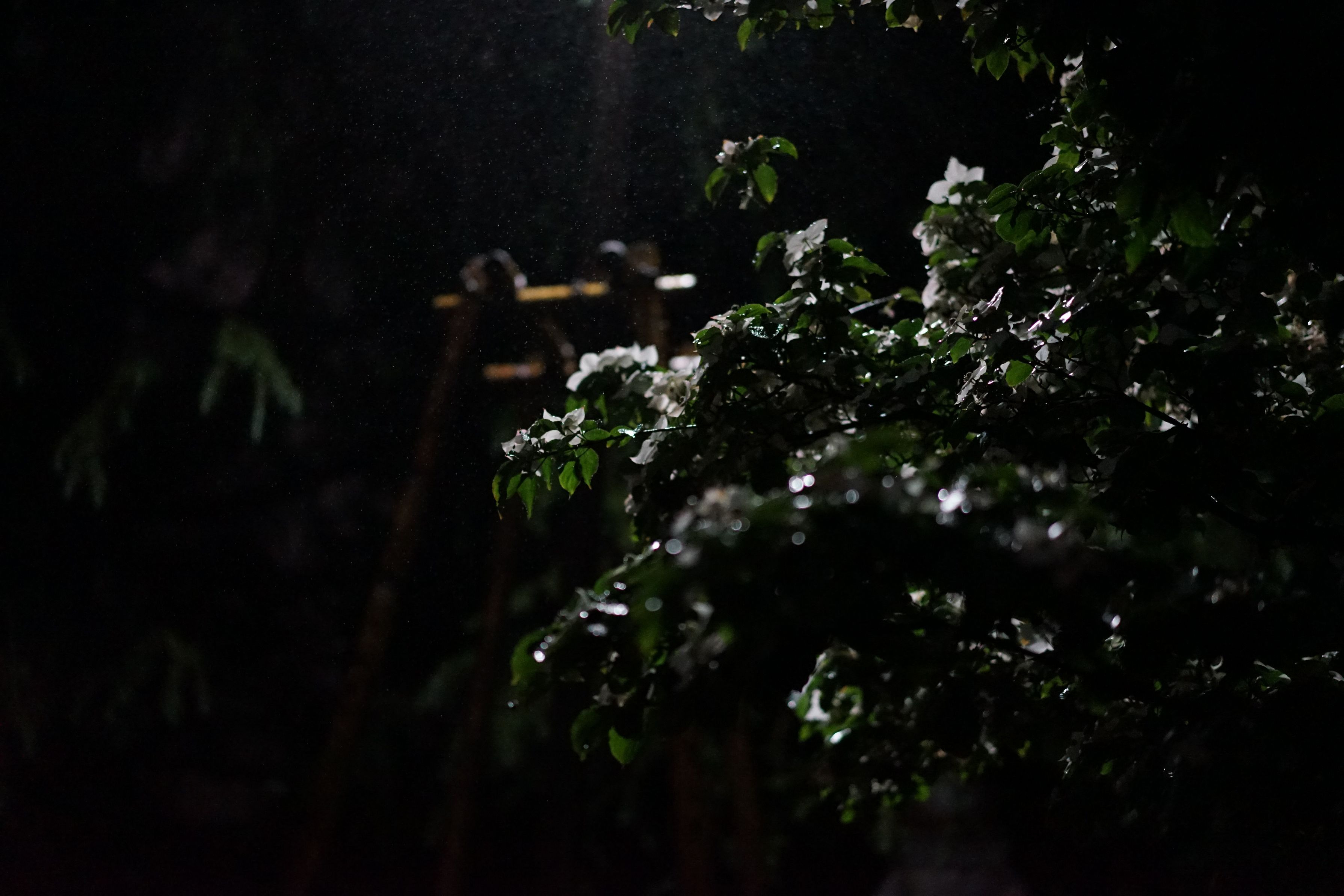 雨の中、福岡の夜散歩。 寒かった〜! 公園の電灯が、ハナミズキ(?)を照らしていた。