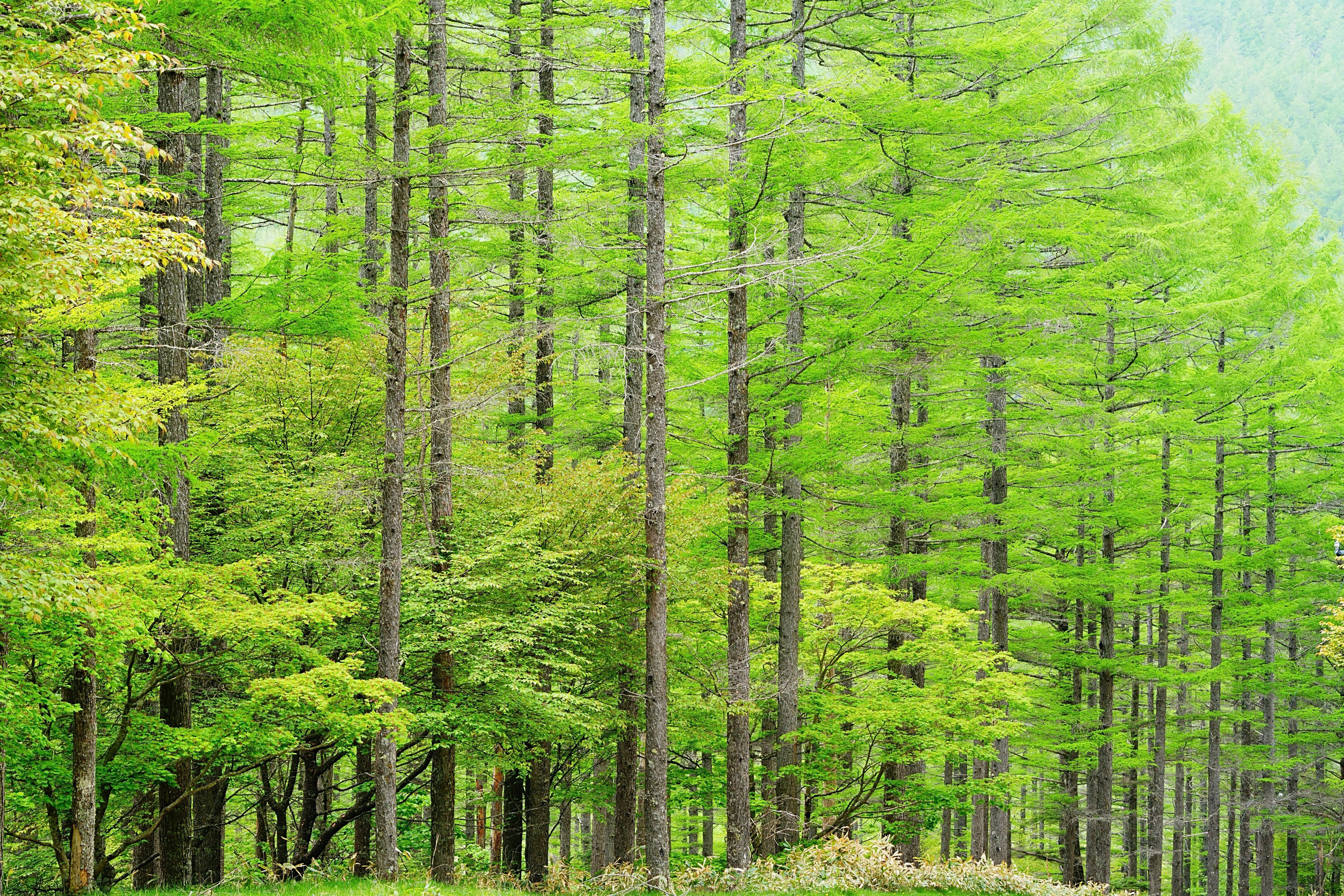 新緑が美しいカラマツ林。自然の息吹を感じる五月の緑です。