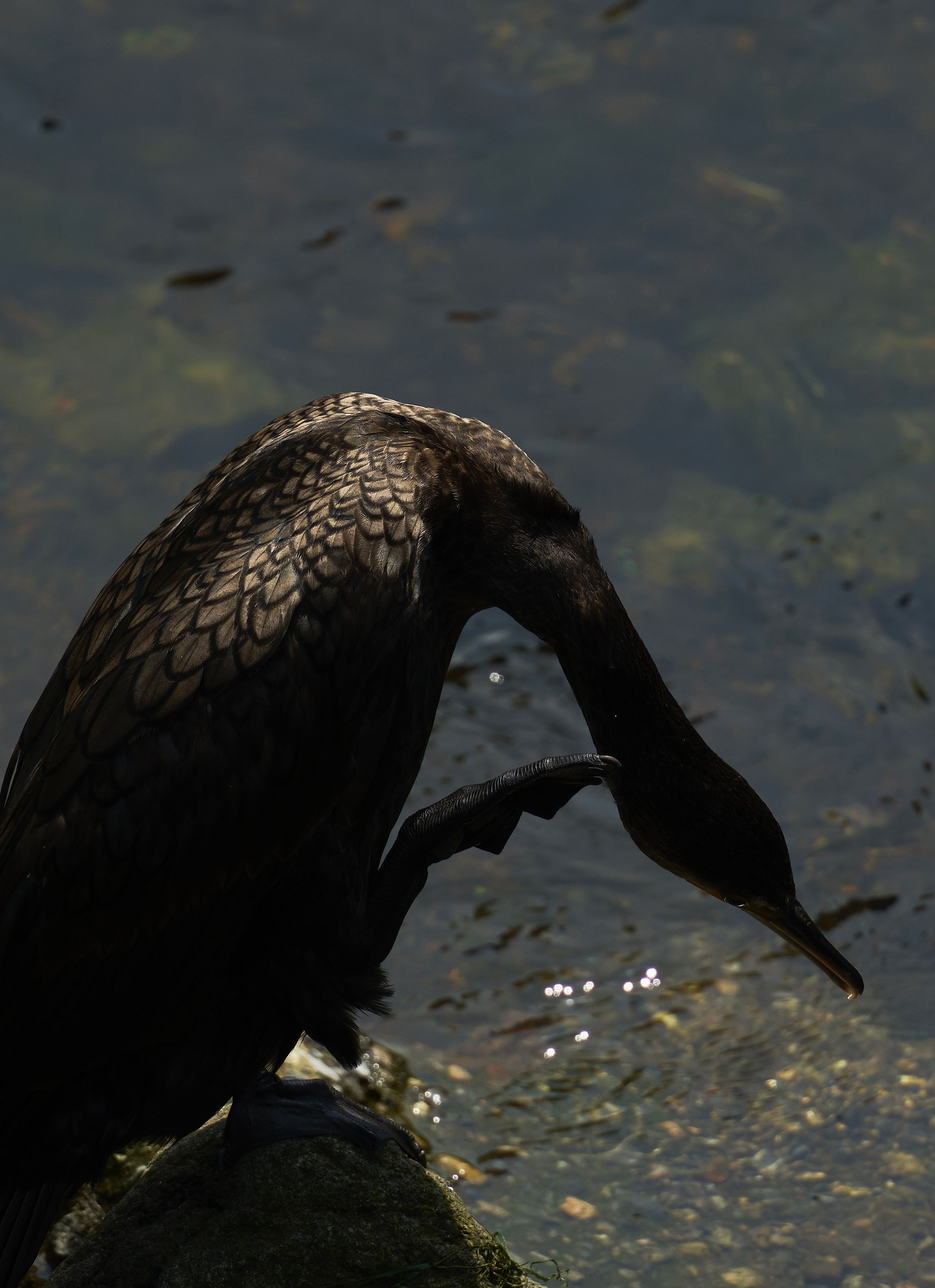 川で休憩中のカワウ。ふと見ると背中が綺麗に輝いて、羽の縁取りがクッキリ。体はシンプルな黒の印象だったので、こんな色味に見えることもあるのか、と驚きました。