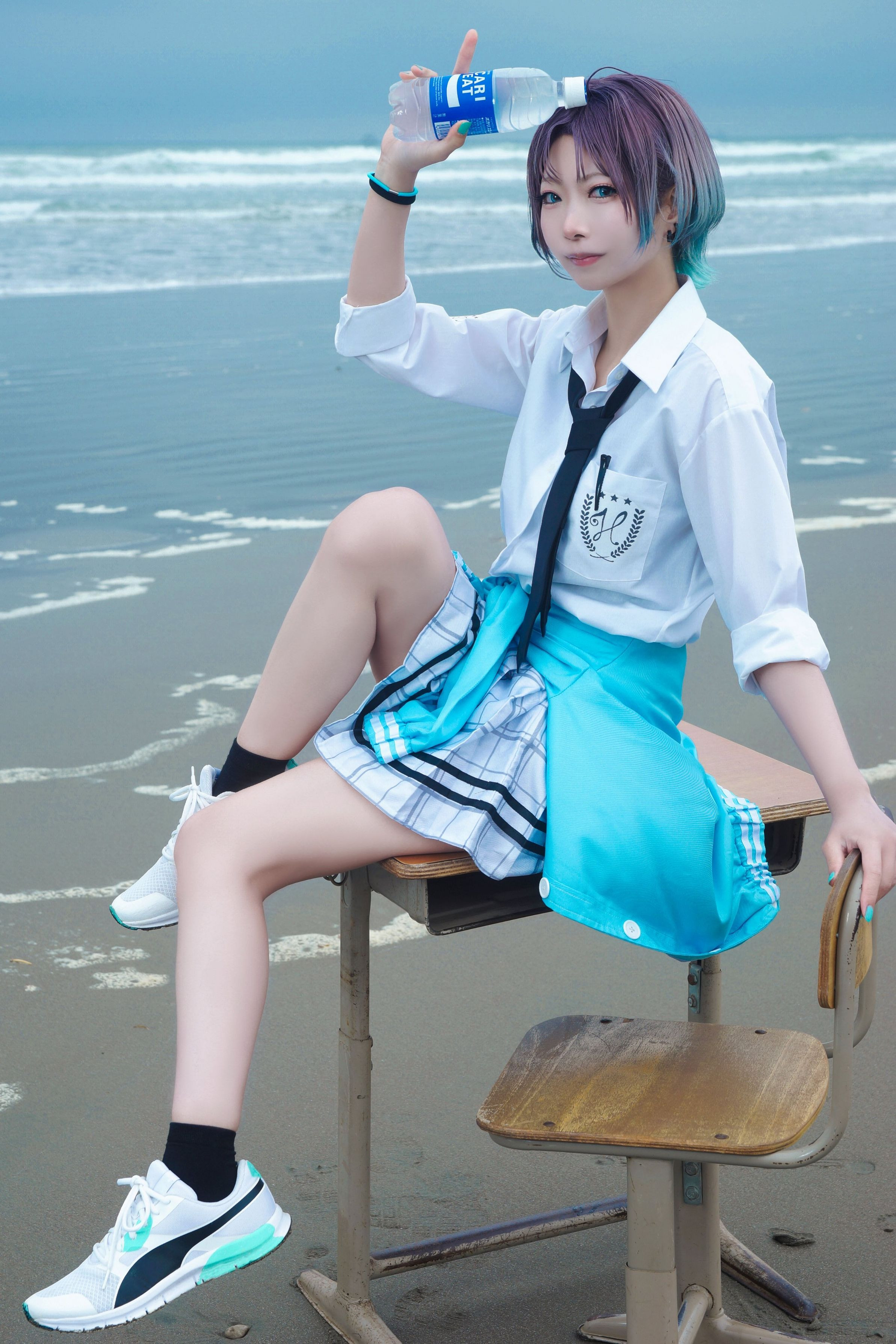 海岸で学校机と椅子持ち込んで撮影しました。