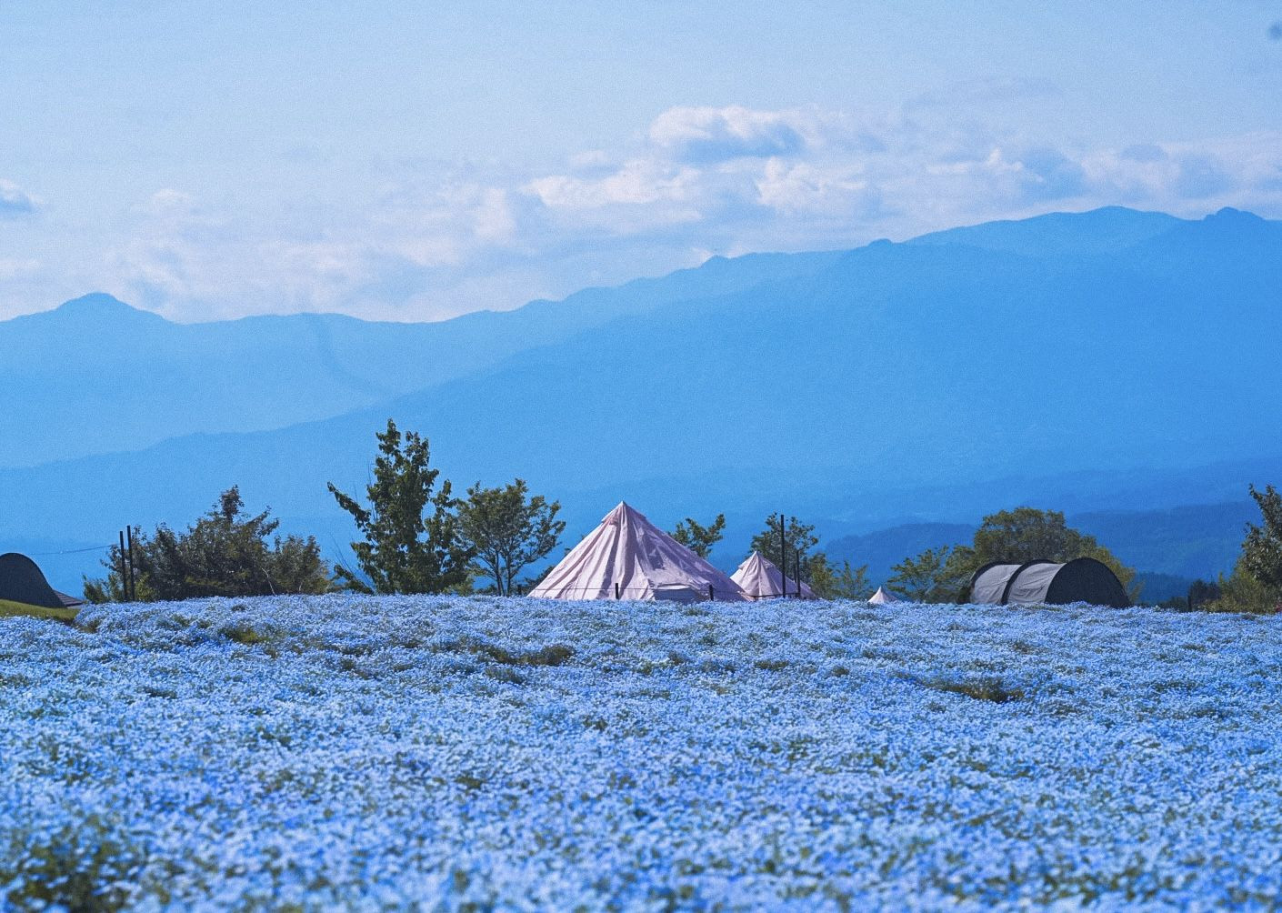 大分県くじゅう花公園のネモフィラ、まだまだ見頃です。 テントに泊まったら最高の時間を過ごすことができるでしょうね。