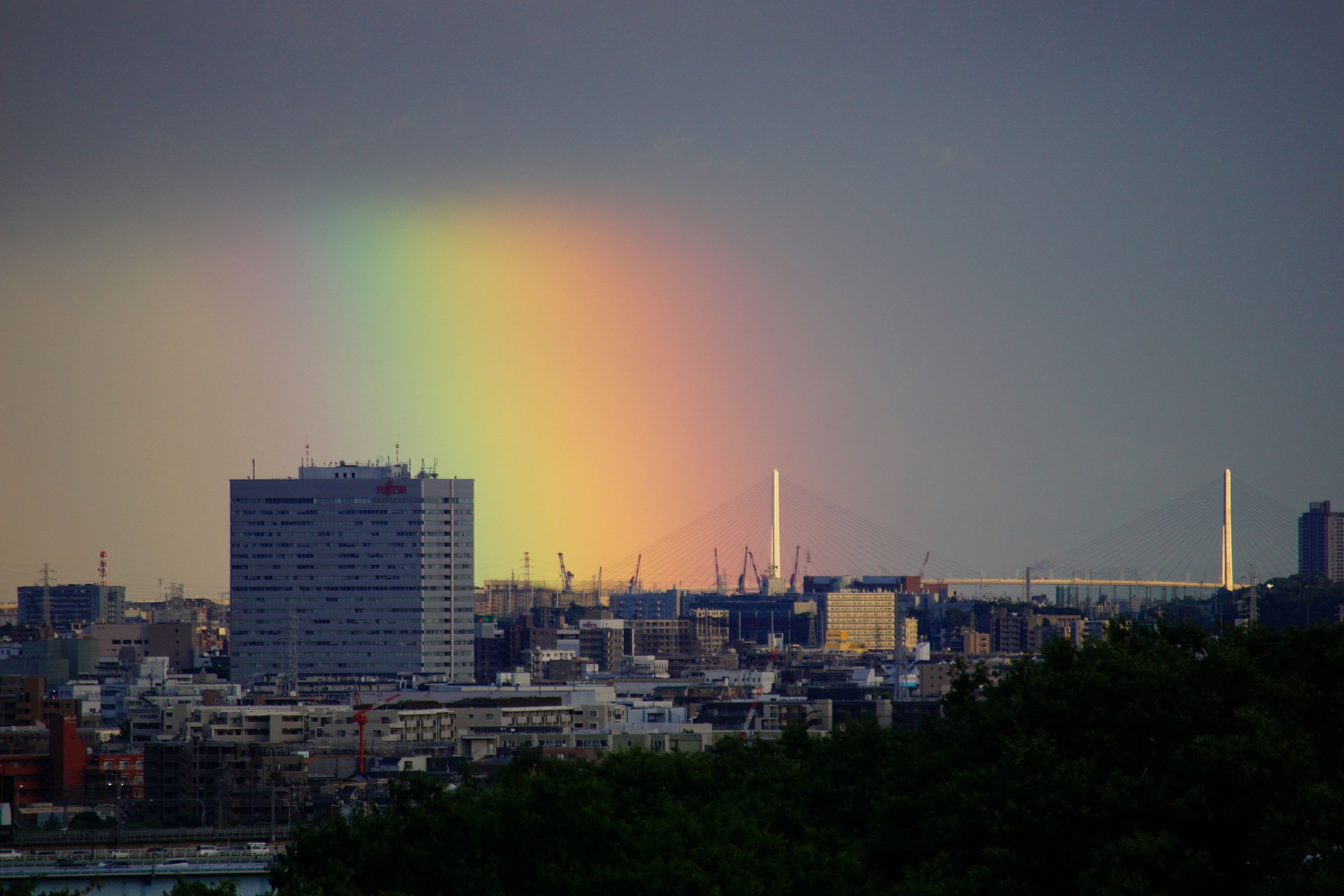 雨上がりの夕刻、東京湾方面にカーテンのような虹が現れました。白い塔は鶴見つばさ橋です。