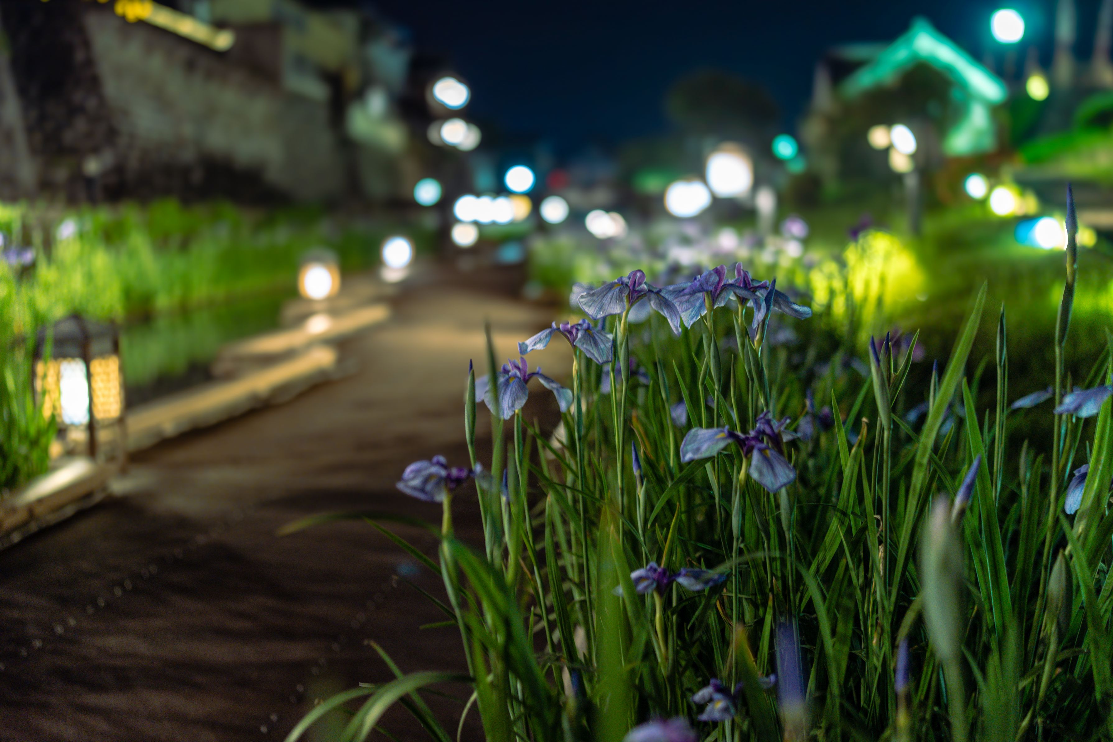熊本県玉名市「高瀬裏川花しょうぶまつり」。廻船の船着き場として栄えた同地で毎年開催されるイベントで、夜はライトアップに照らされる美しい菖蒲を眺められます。