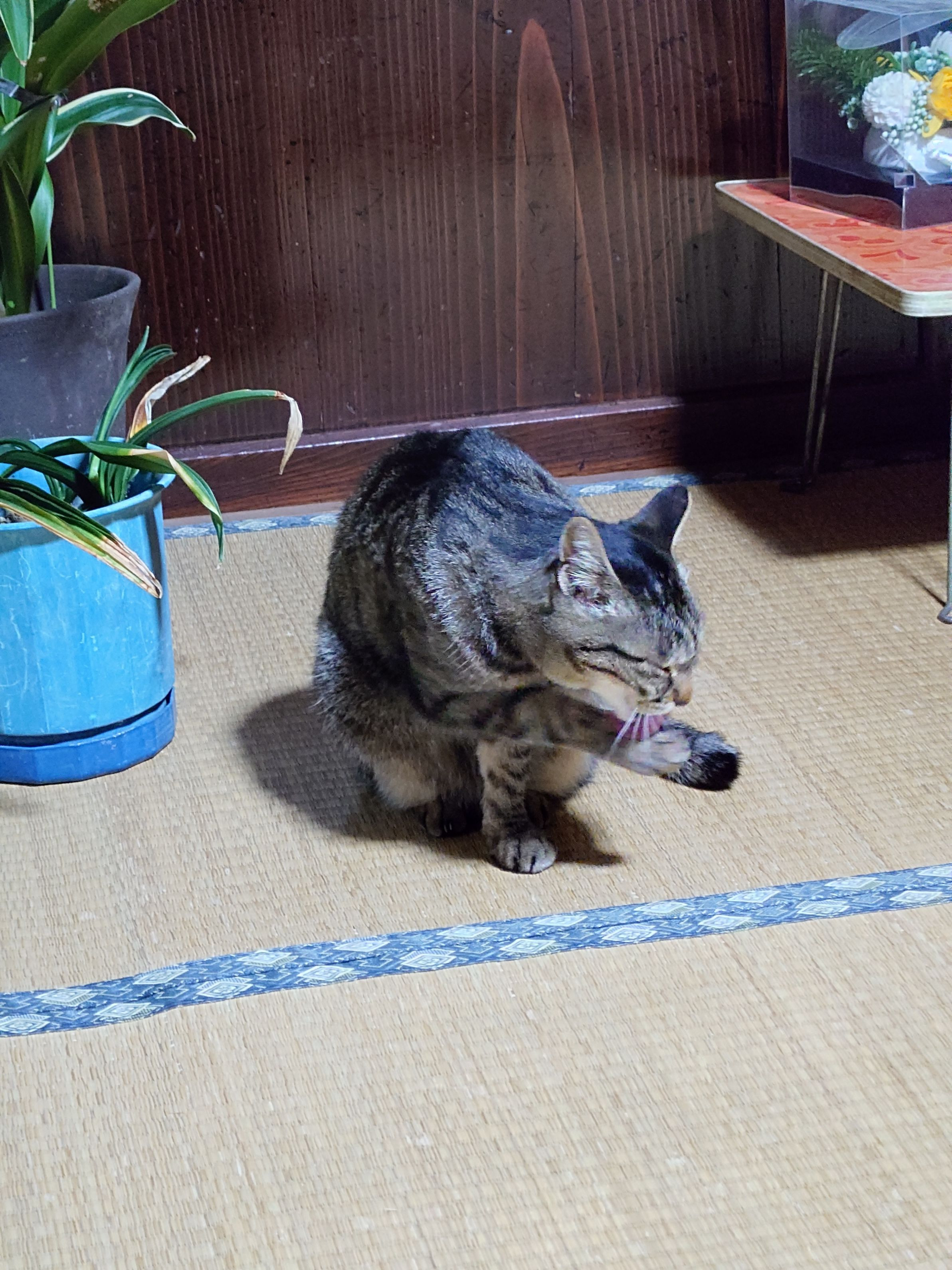 実家のみーちゃんが食事あとで毛づくろいしています。あまり人前でしないのでやっと撮れました。