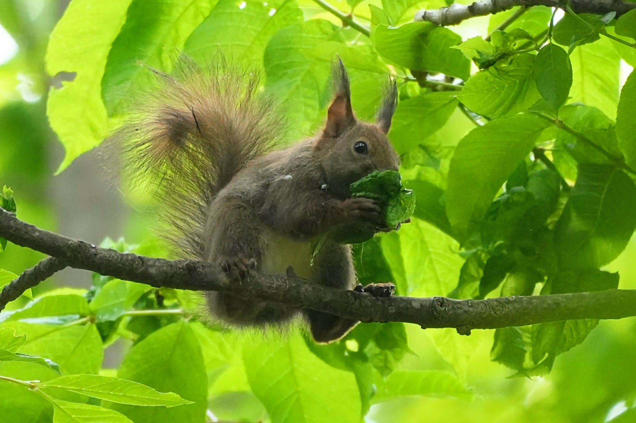 春に産まれたエゾリスたちも、1匹で行動するようになったようです。久しぶりに会ったらもう完全に大人サイズでしたw 懸命に葉っぱを食べる姿をみせてくれました。エゾリスは雑食なので割と何でも食べます。