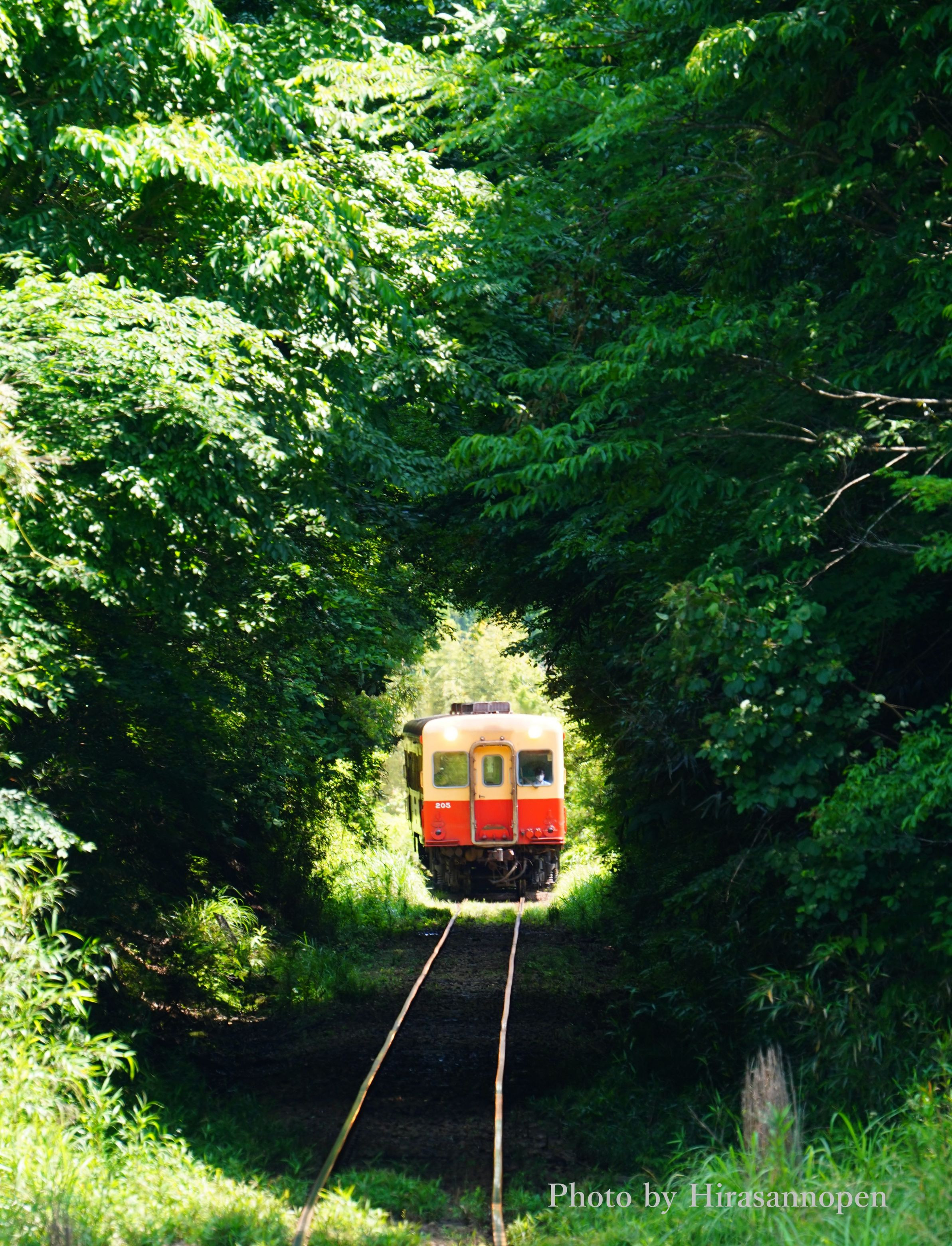 新緑のトンネルへと進む一両の電車(千葉県・小湊鐡道です)。