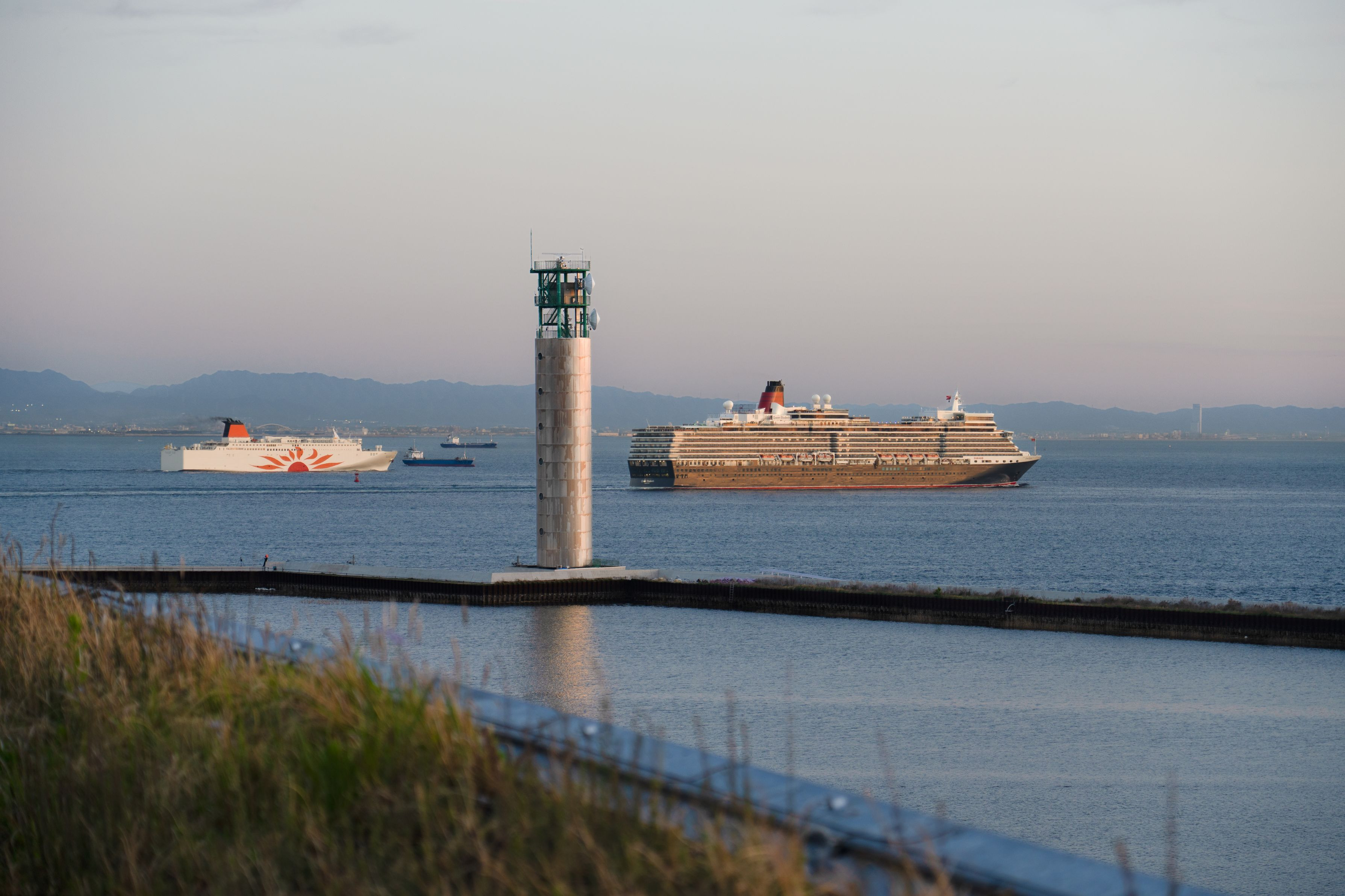 夕暮れの大阪・関西万博の大屋根リングから、クイーンエリザベス と さんふらわあ が2隻が出港していました。クリーンエリザベスの後をついていくかのように(*^^*) 1枚目の方が後に撮影しました。105mmのズームでsuper35mm撮影