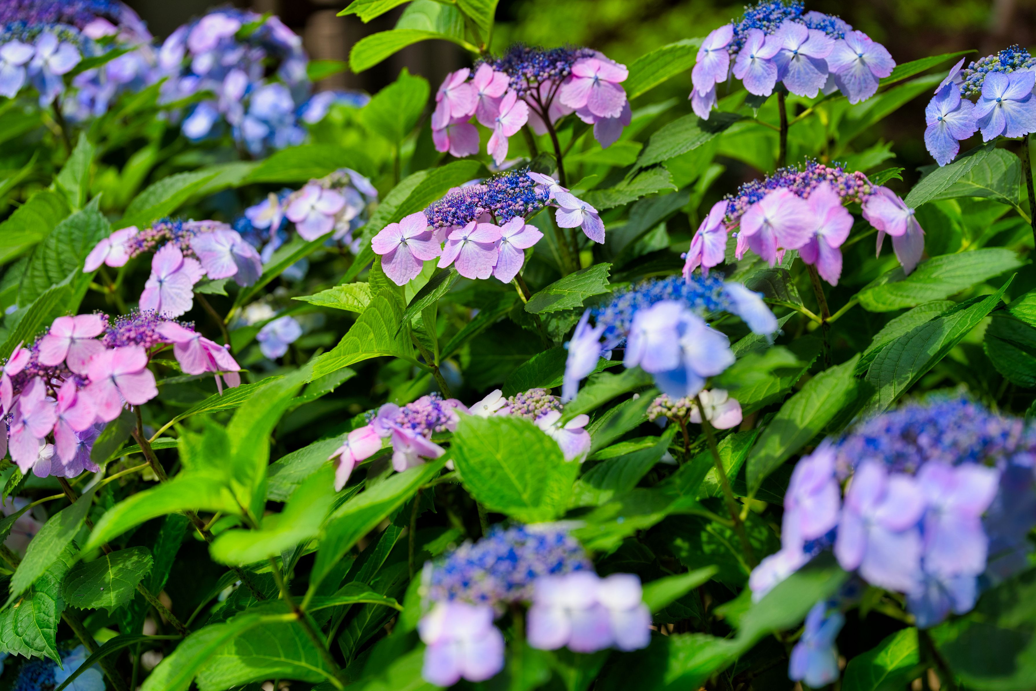 70㎜の圧縮効果、赤/青・紫陽花を繰り返しで 視線誘導で色のリズム感をハイキーローキー で表現しました。 #フラワー2025#