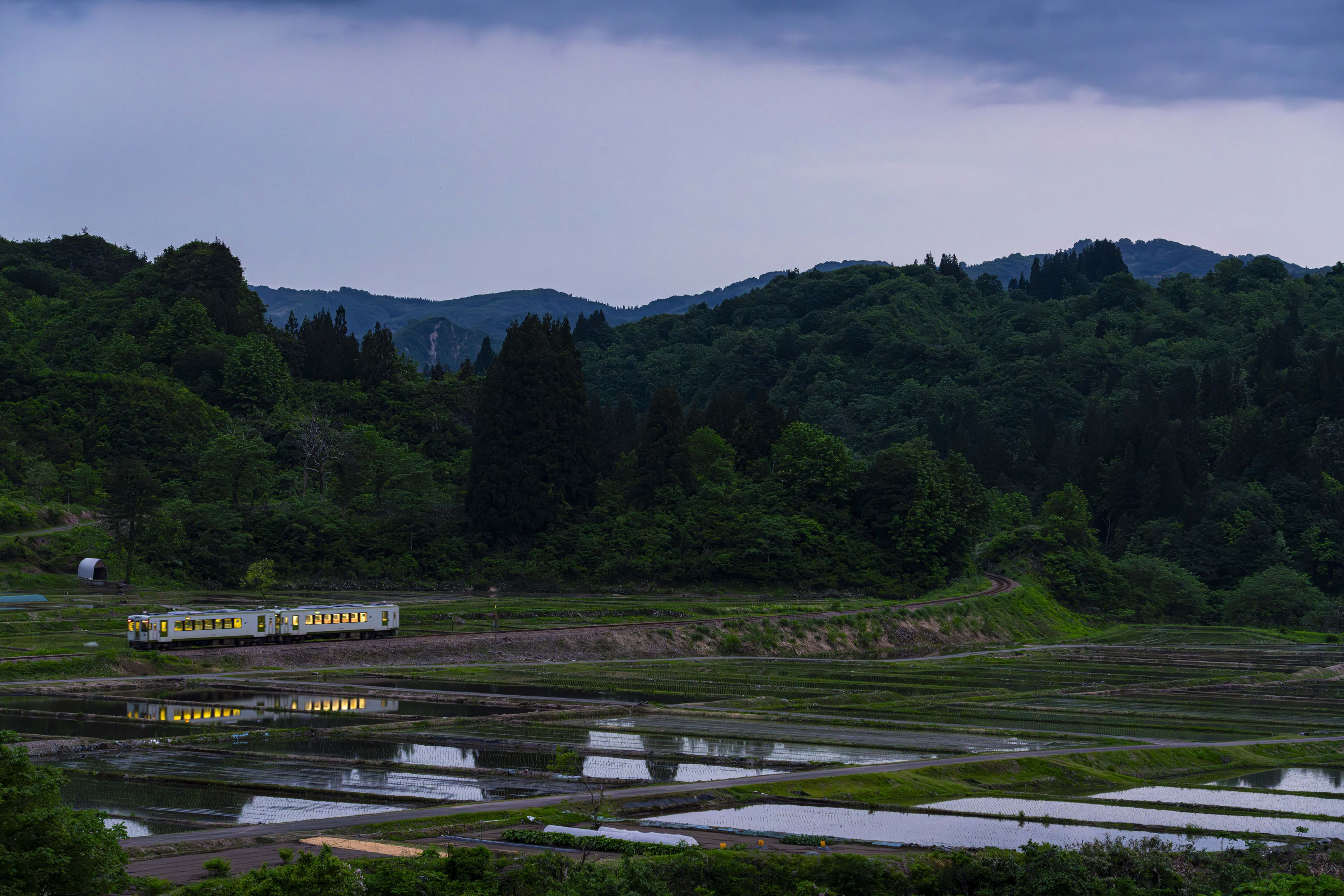 夕闇の棚田を走る列車を写りこみを入れて撮影しました。