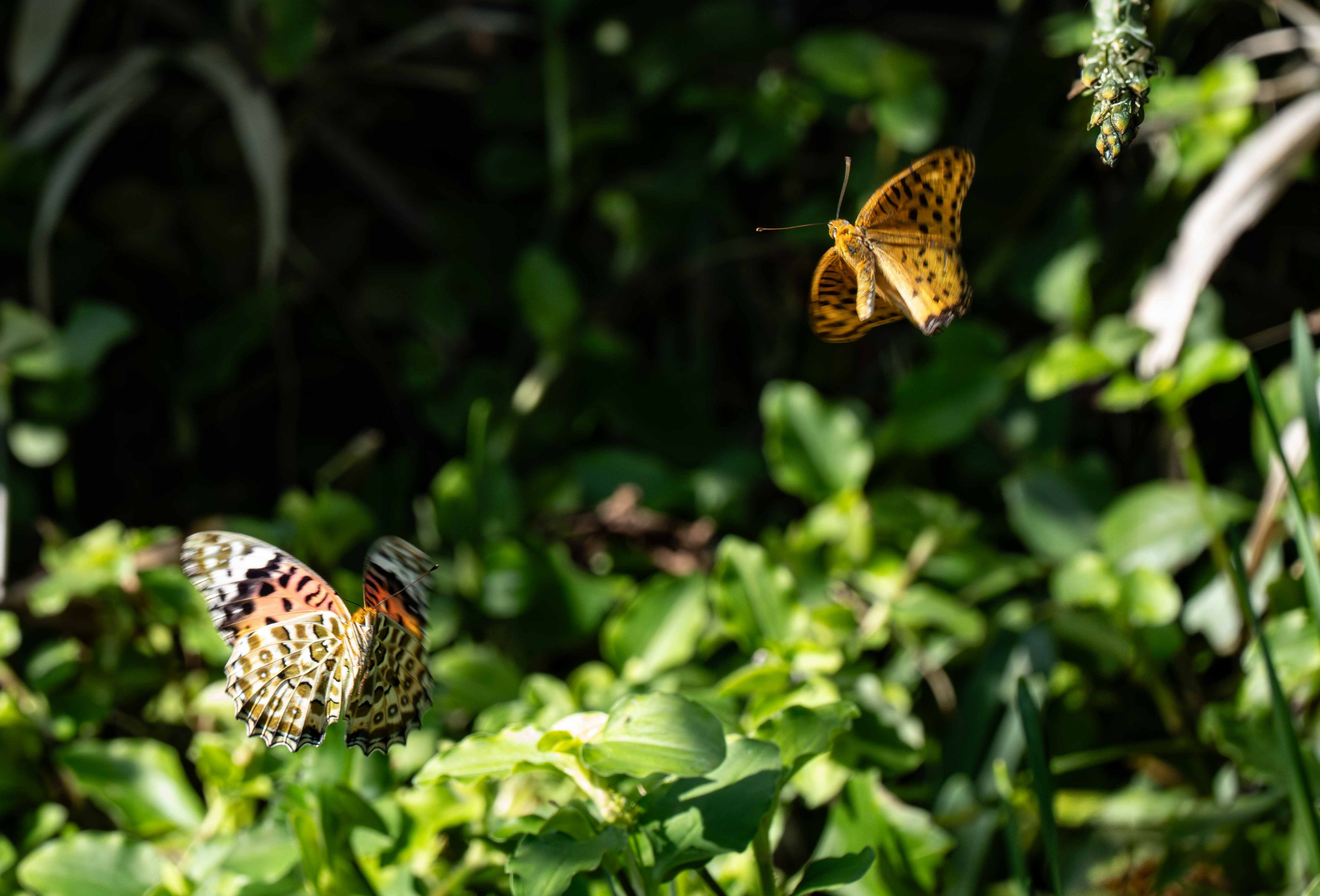 横浜市の自宅近くの写真。左下のツマグロヒョウモン♀に右上のツマグロヒョウモン♂が求愛しているところ。♂は♀の前に出て地上に止らせようとしています。