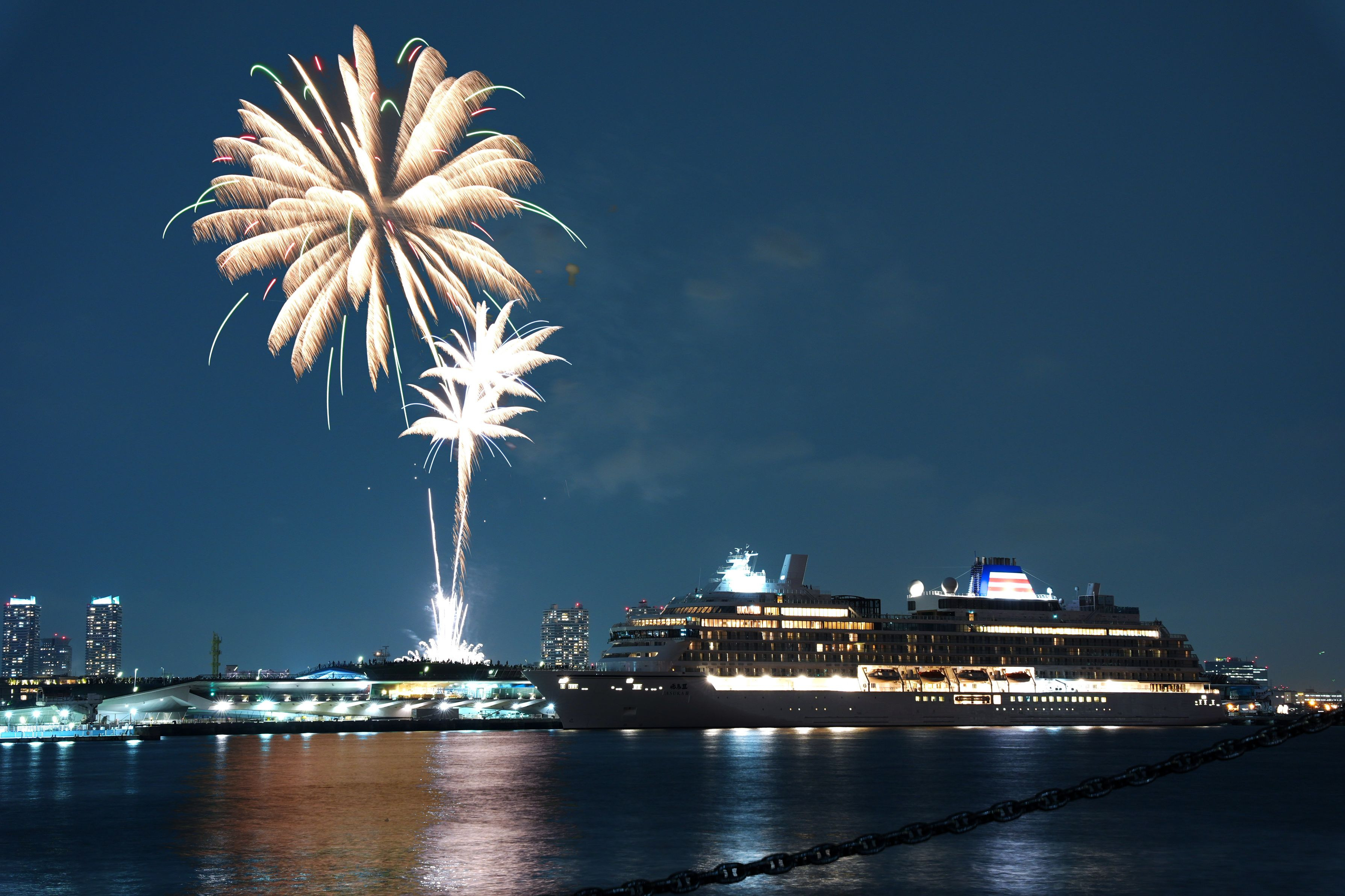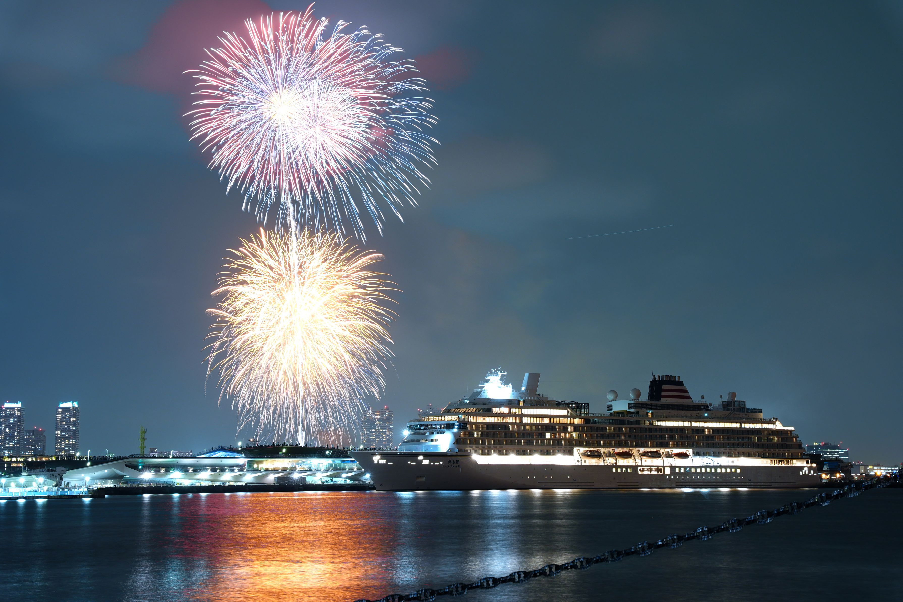 横浜開港記念祭で花火大会が行われました。 それに合わせて(多分)、ドイツで建造された新造船”飛鳥Ⅲ”が大桟橋に初入港しました。