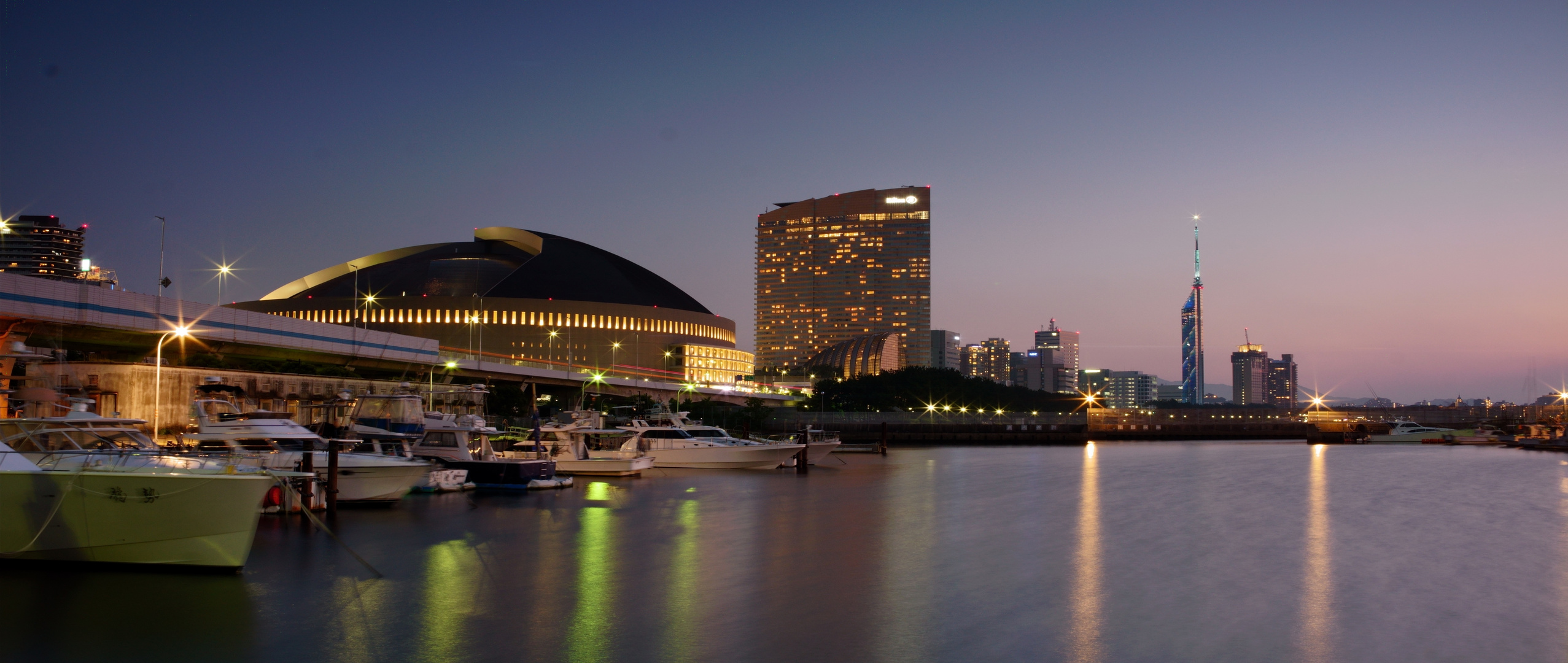 日が落ちて間もない夜景。 もう少し待てばヒルトンの室灯が増えて綺麗になりそうだったけど、バッテリーを充電するのを忘れてしまってここで終了。