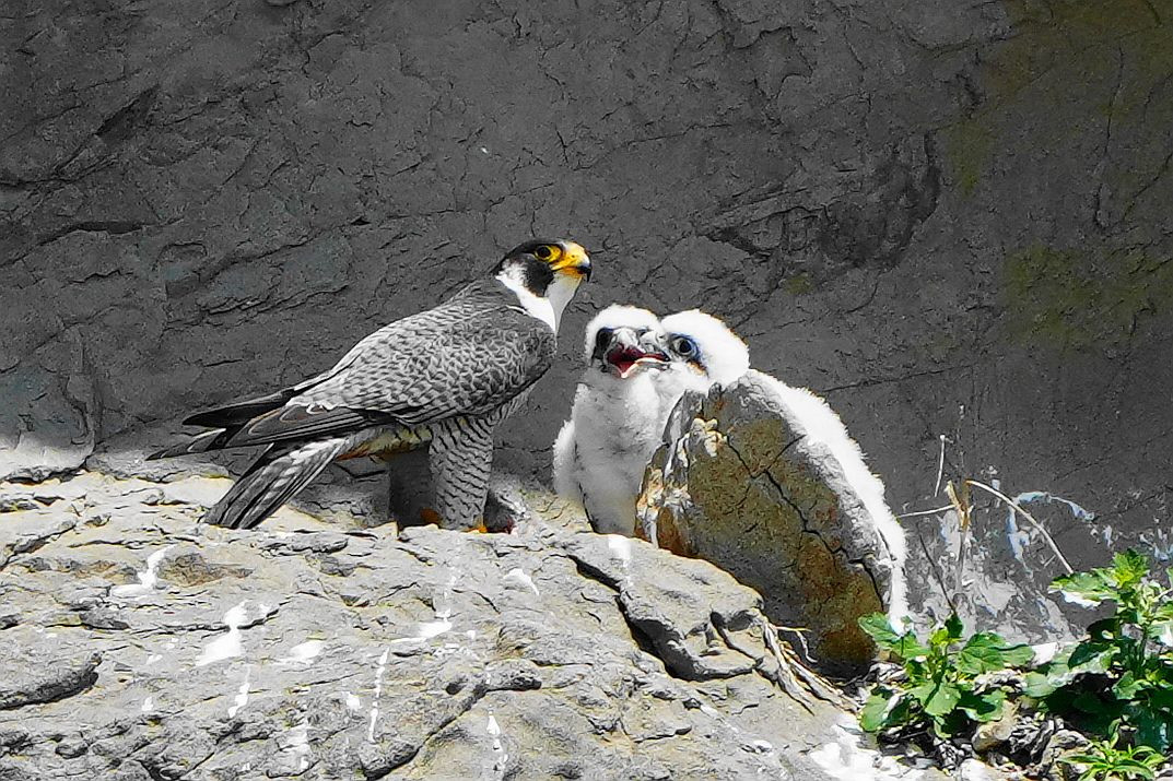 子育て中のハヤブサの親子。親鳥が狩ってきた獲物でお食事中