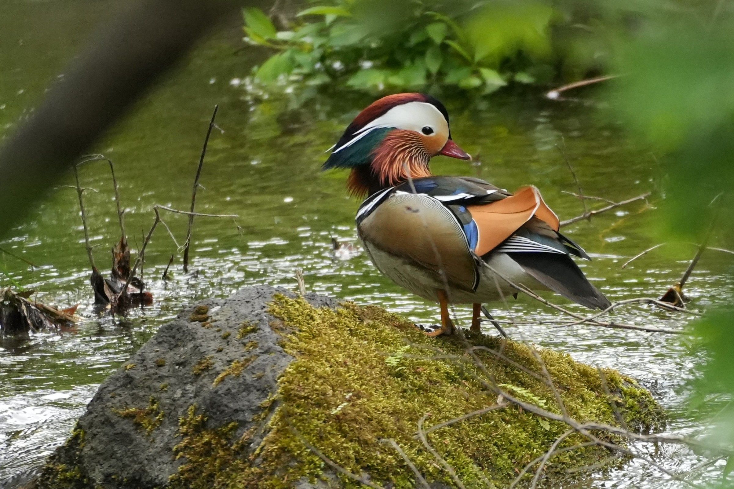 地味な色になる前にと思い、オシドリ♂を。 ※タイトルは私の勝手な想像。 既にメスとのペアは解消済み。 そしてオスは子育てには一切関与しません。