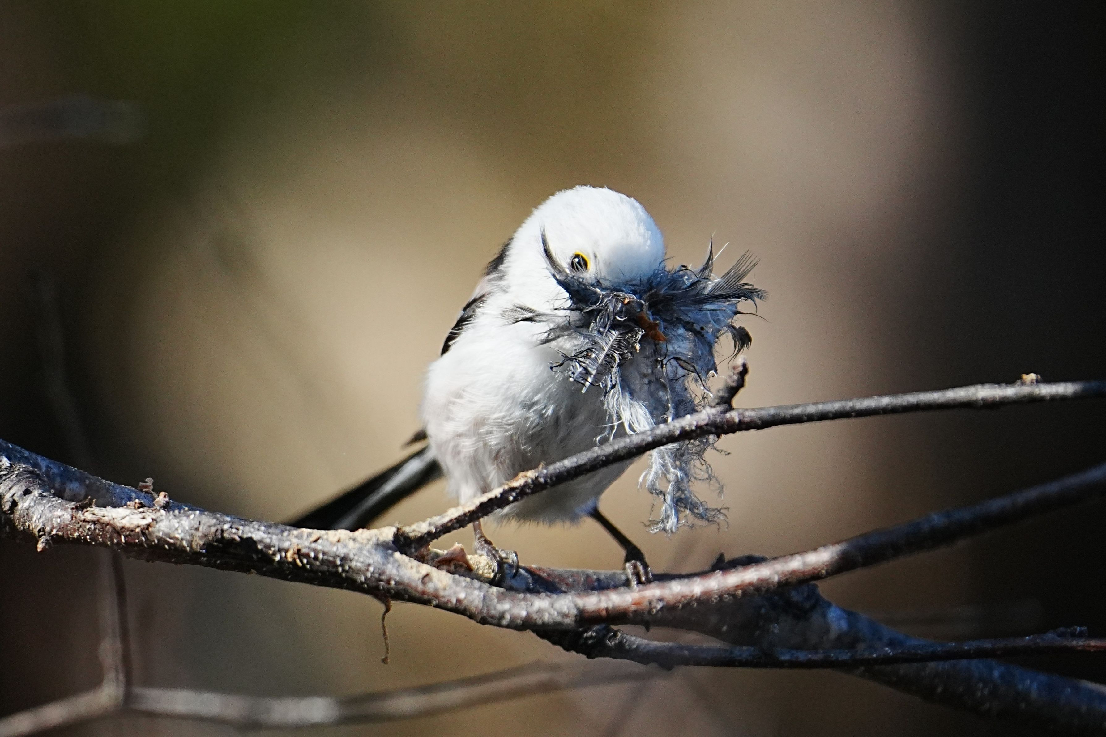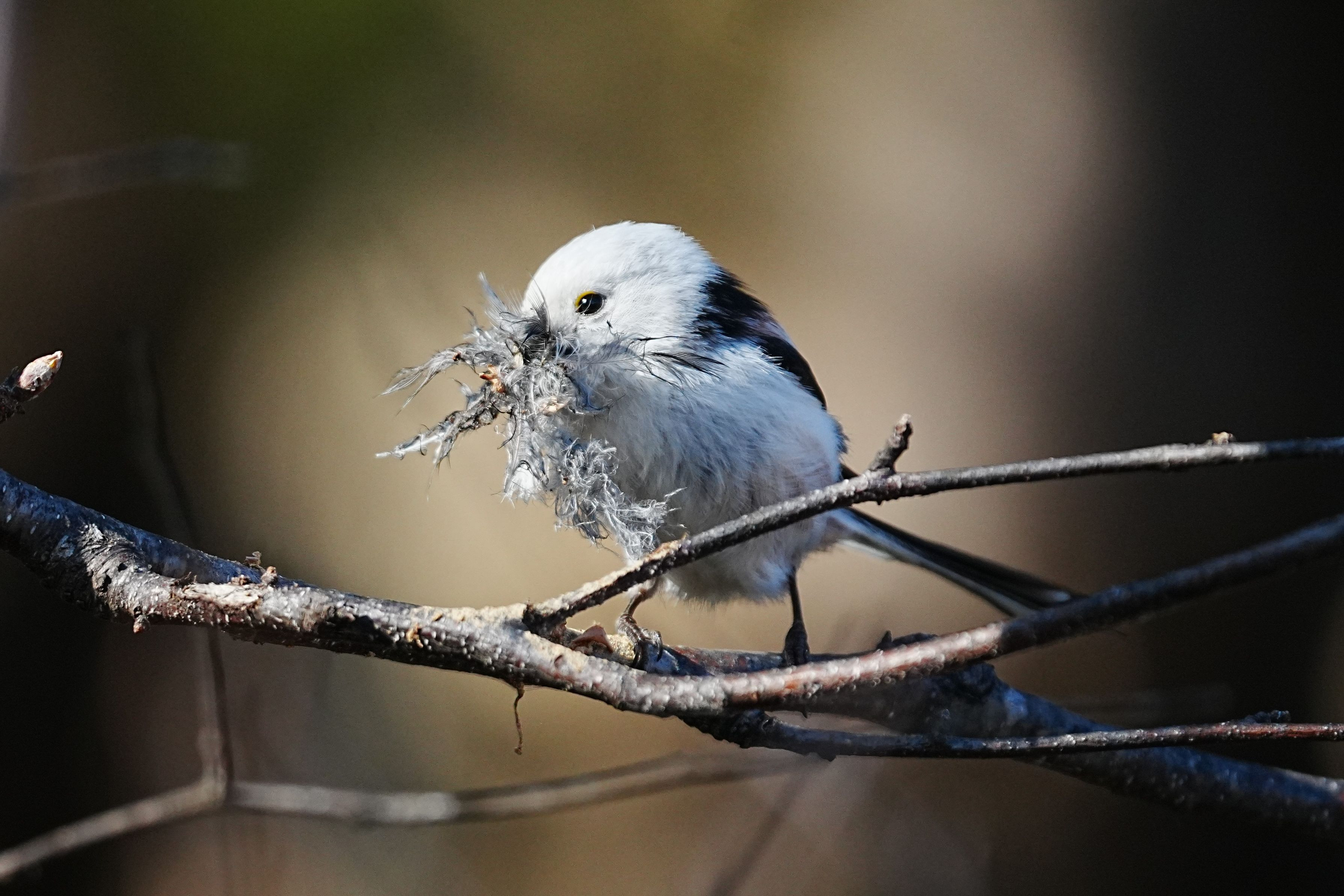 巣の素材を集めていたシマエナガです。 そんなに集めると、飛べなくなりそうでした。 4月9日撮影