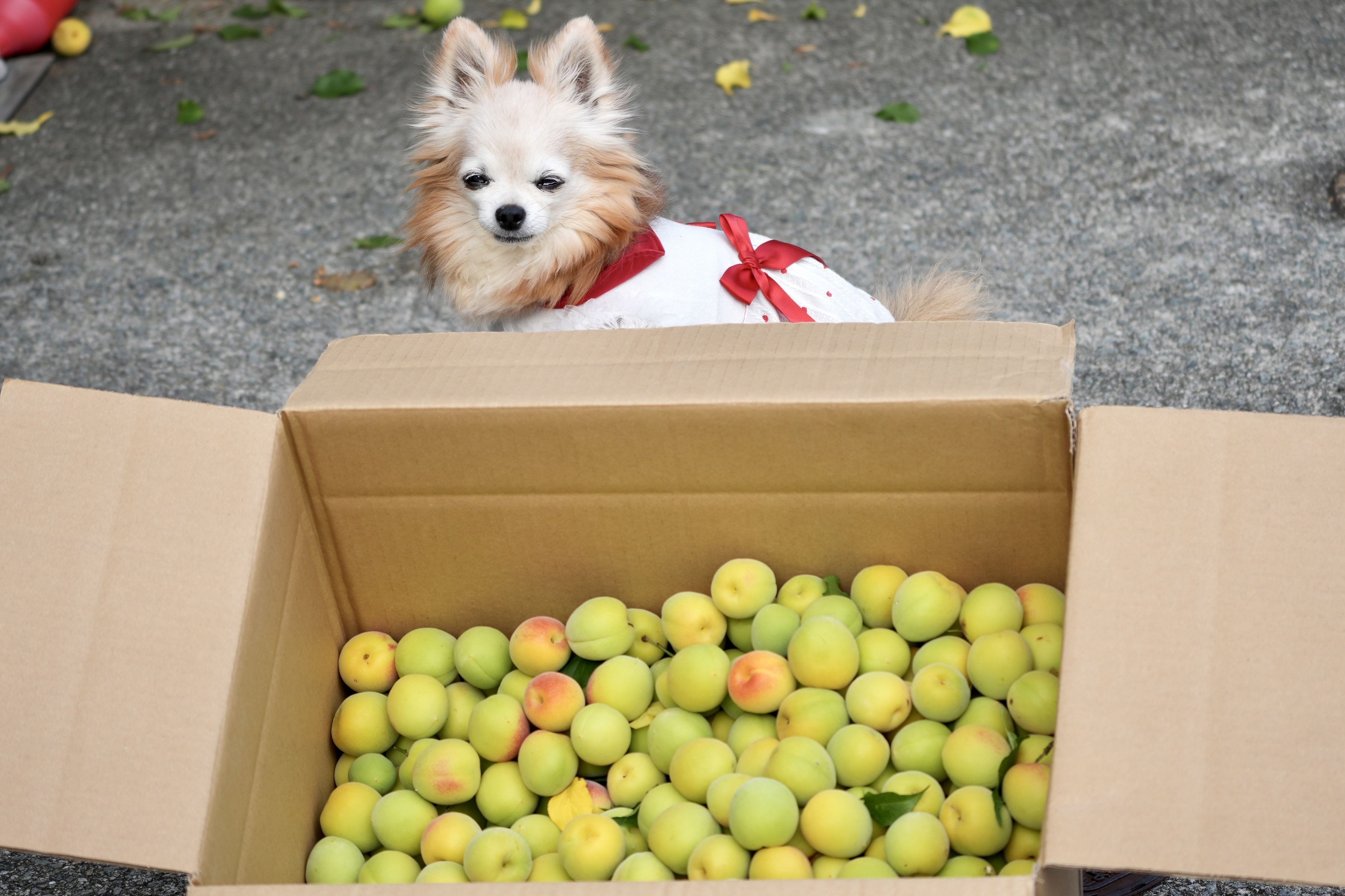 昨年は身が大きくなる前に鳥さんたちに全部落とされてしまった梅の実。 今年は大豊作で10kg以上収穫できました♪ 収穫してすぐ親戚あげました。 ちょこは外が眩しくて何枚撮ってもこの表情でした。