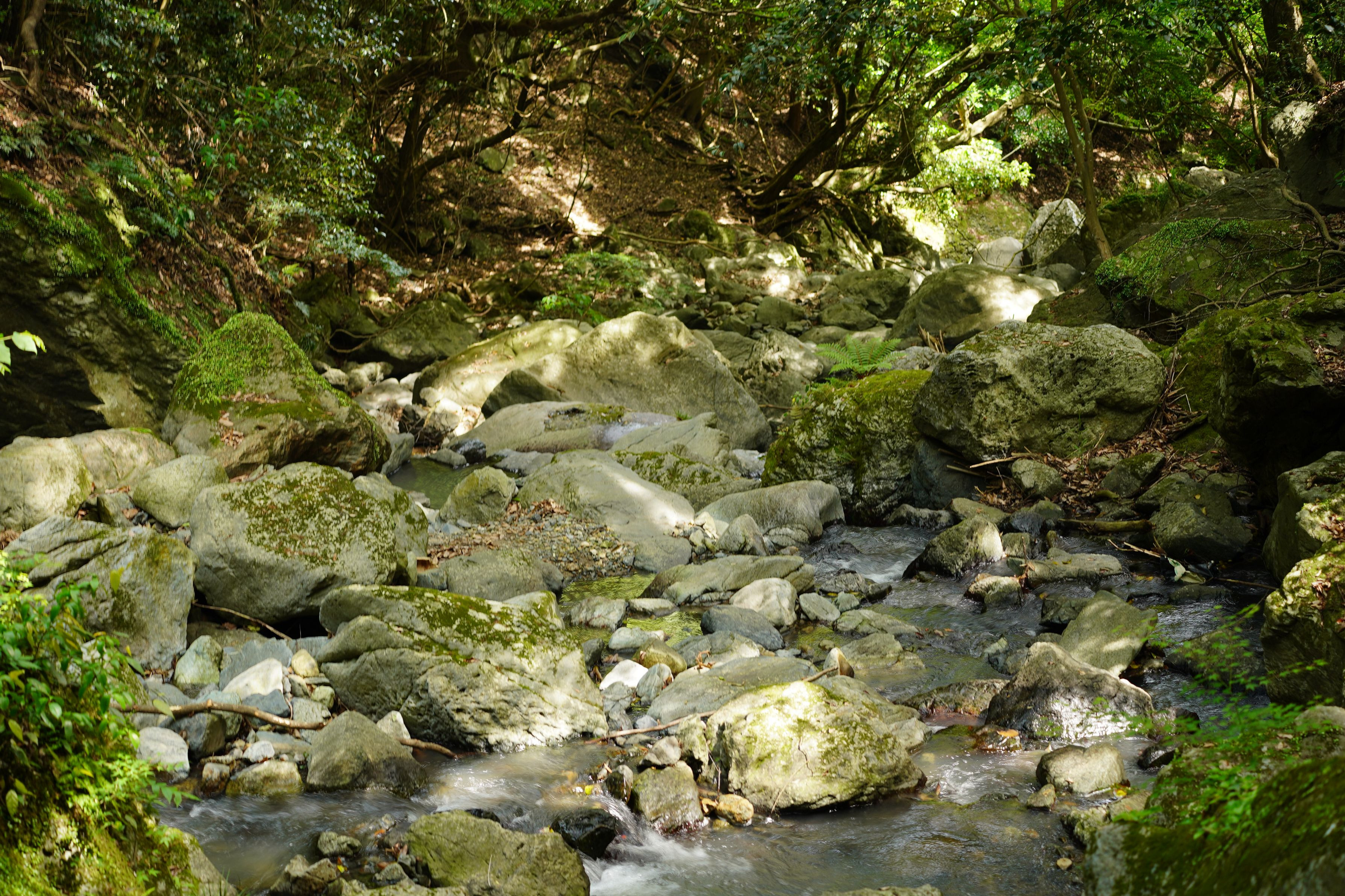 滝の下流にはゴツゴツした大きい岩がたくさんありましたが、 薄日が射していい感じでした。