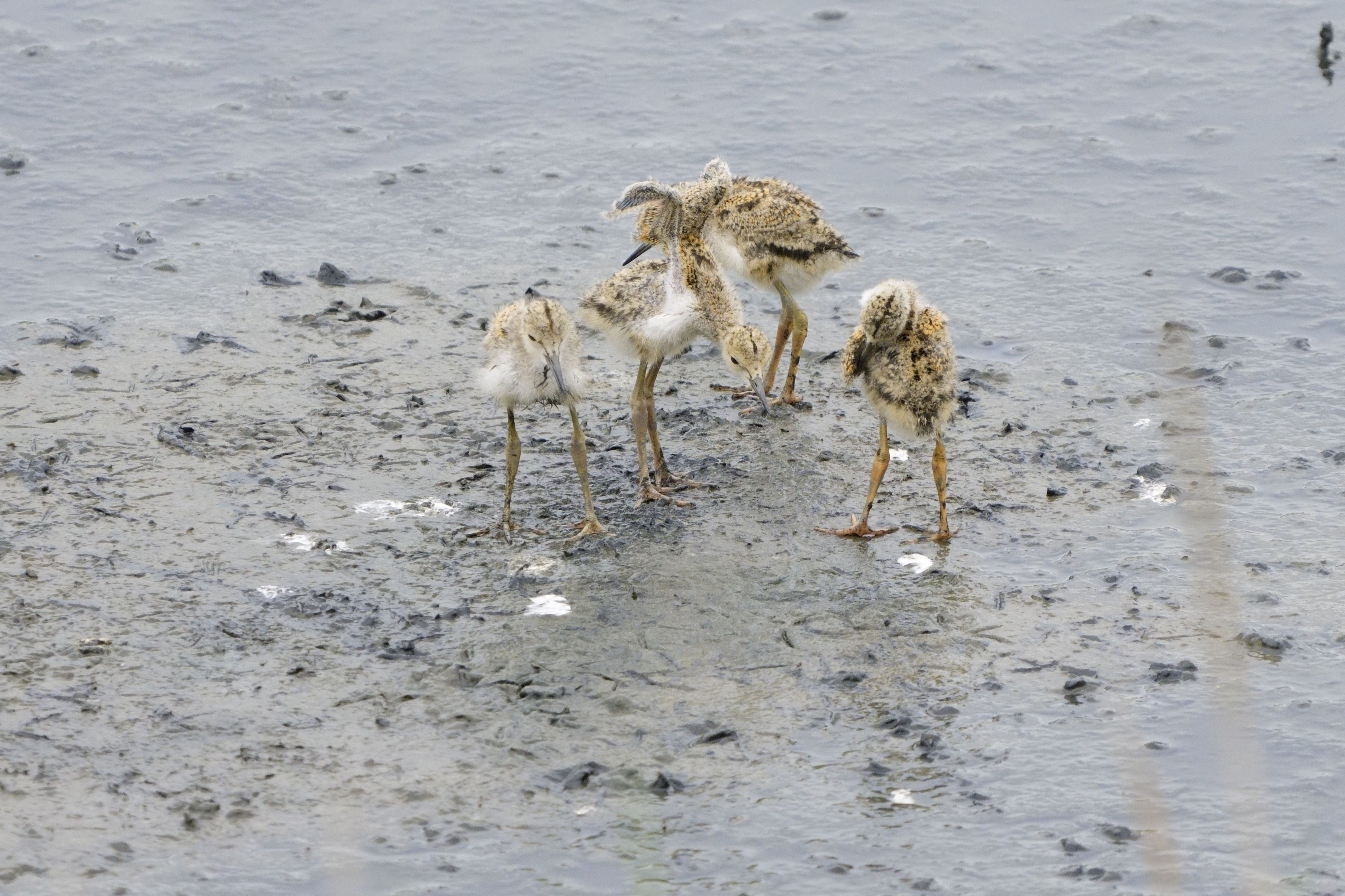 #セイタカシギ#のヒナが、子犬や子猫の様に親の所に集まります。 カイツブリが背中に潜るのはよく見ますが、セイタカさんも同じなのでしょうか? エサ渡しはしませんが、親のお腹に潜るヒナがとても可愛かったです。
