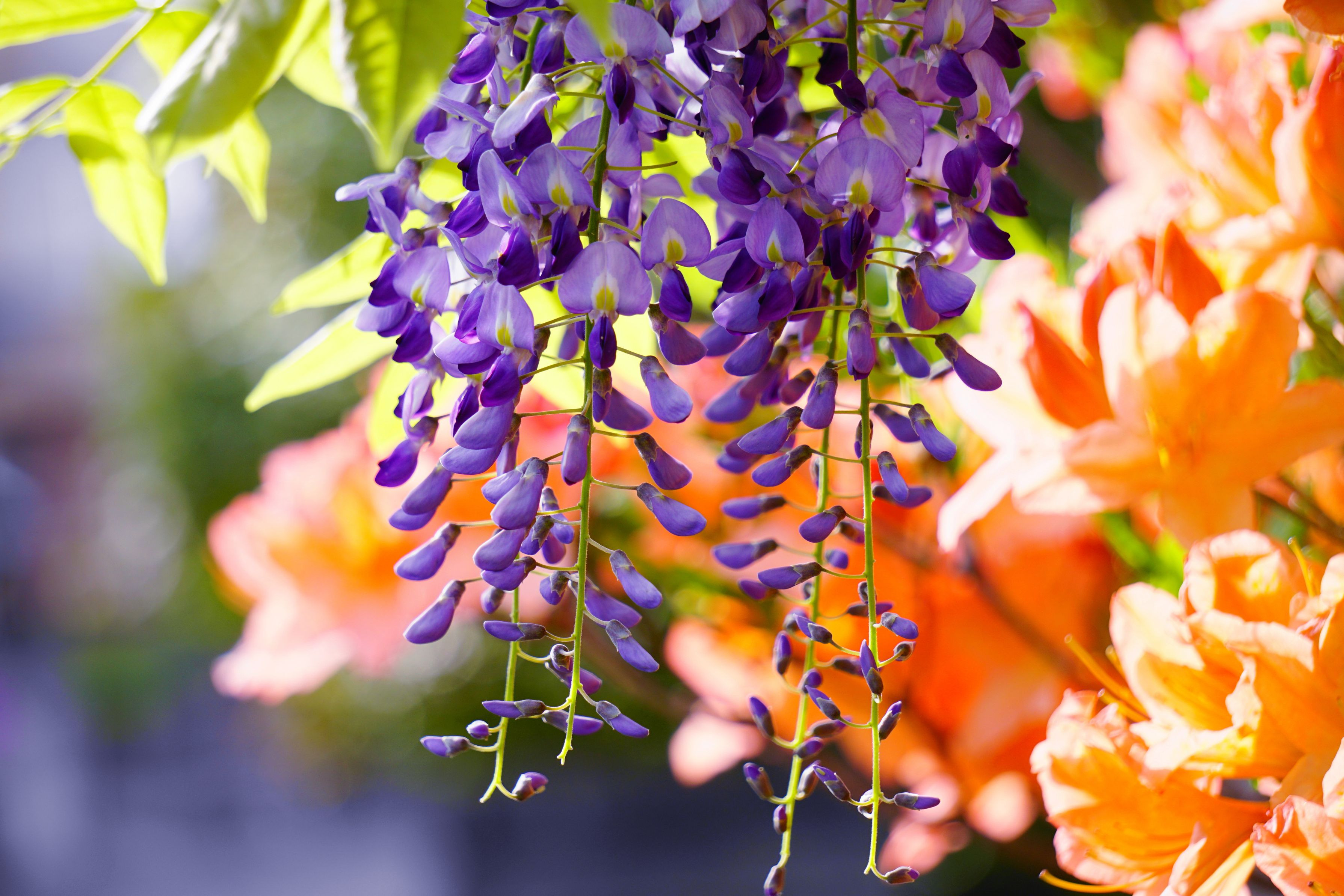 フジとレンゲツツジが咲き競う五月の景色を切り取りました。