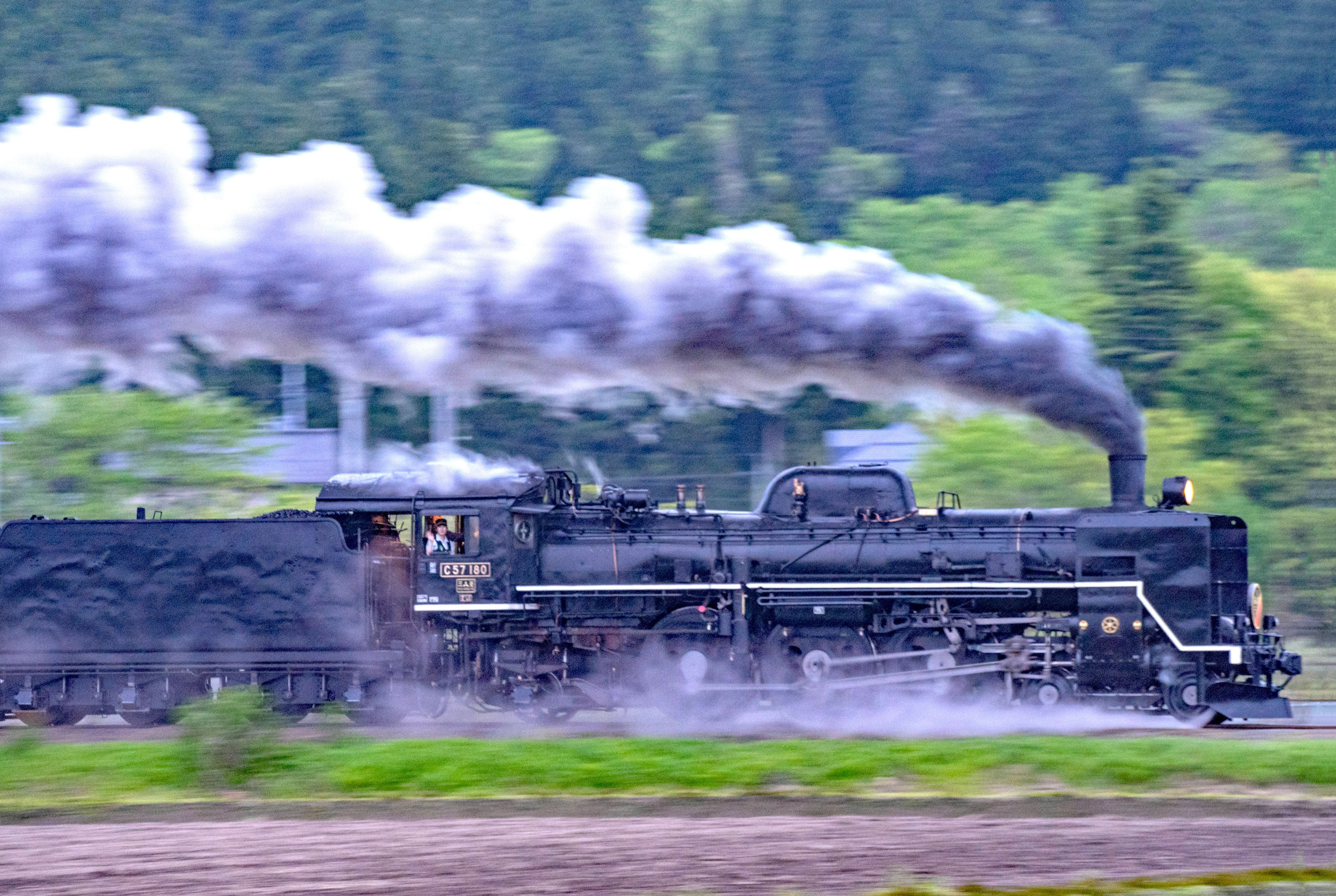 5月初旬の復路・SLばんえつ物語。曇天の夕方で暗かったので、スローシャッターで流し撮り。疾走するC57の機関助手席から女性乗務員が手を振ってくれました。SLを永く撮影していますが、このようなシーンは初めてで、貴重な一枚です。