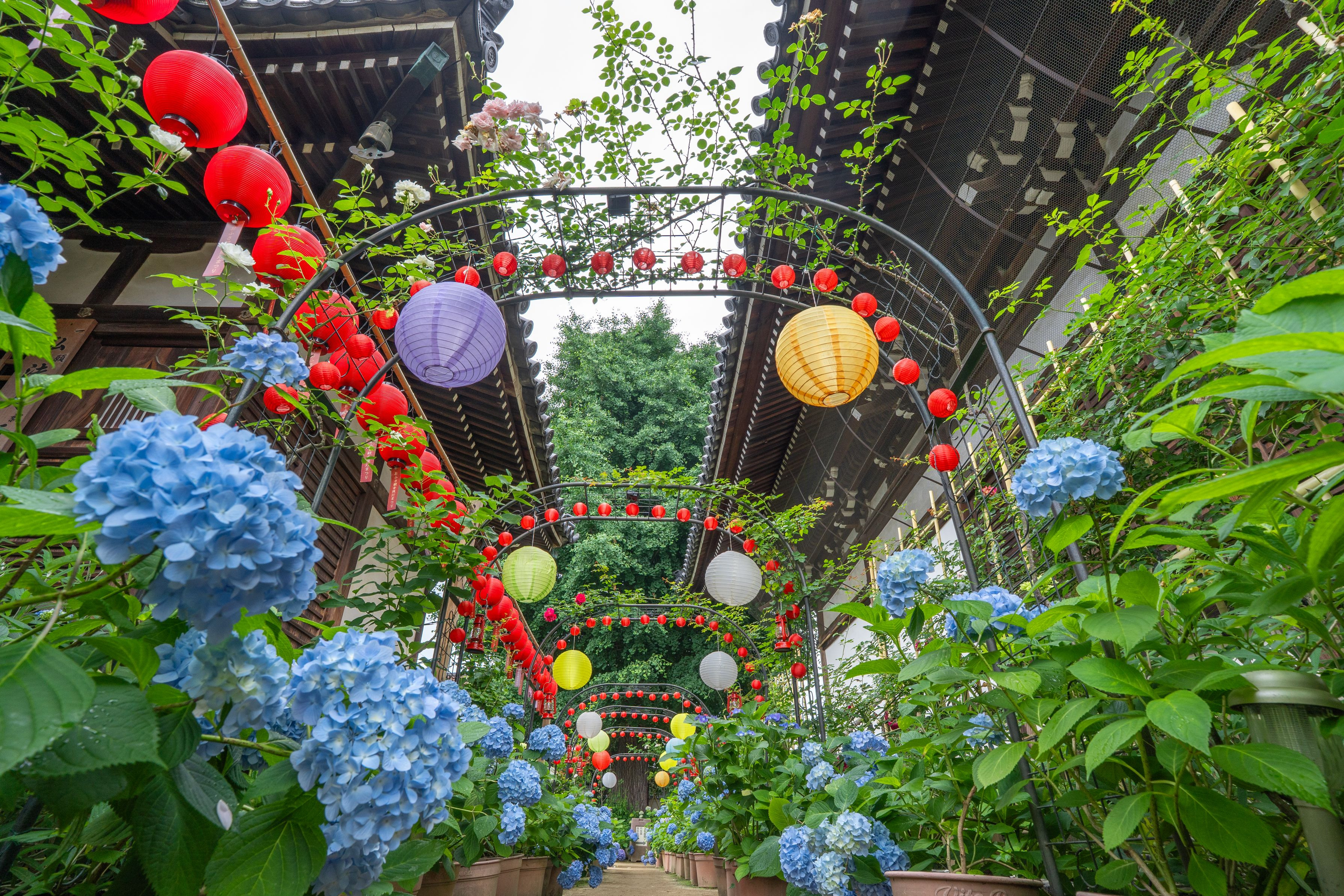 おふさ観音にて 紫陽花と薔薇の同時咲きって あり得るんですね 提灯も相まって要素が多い