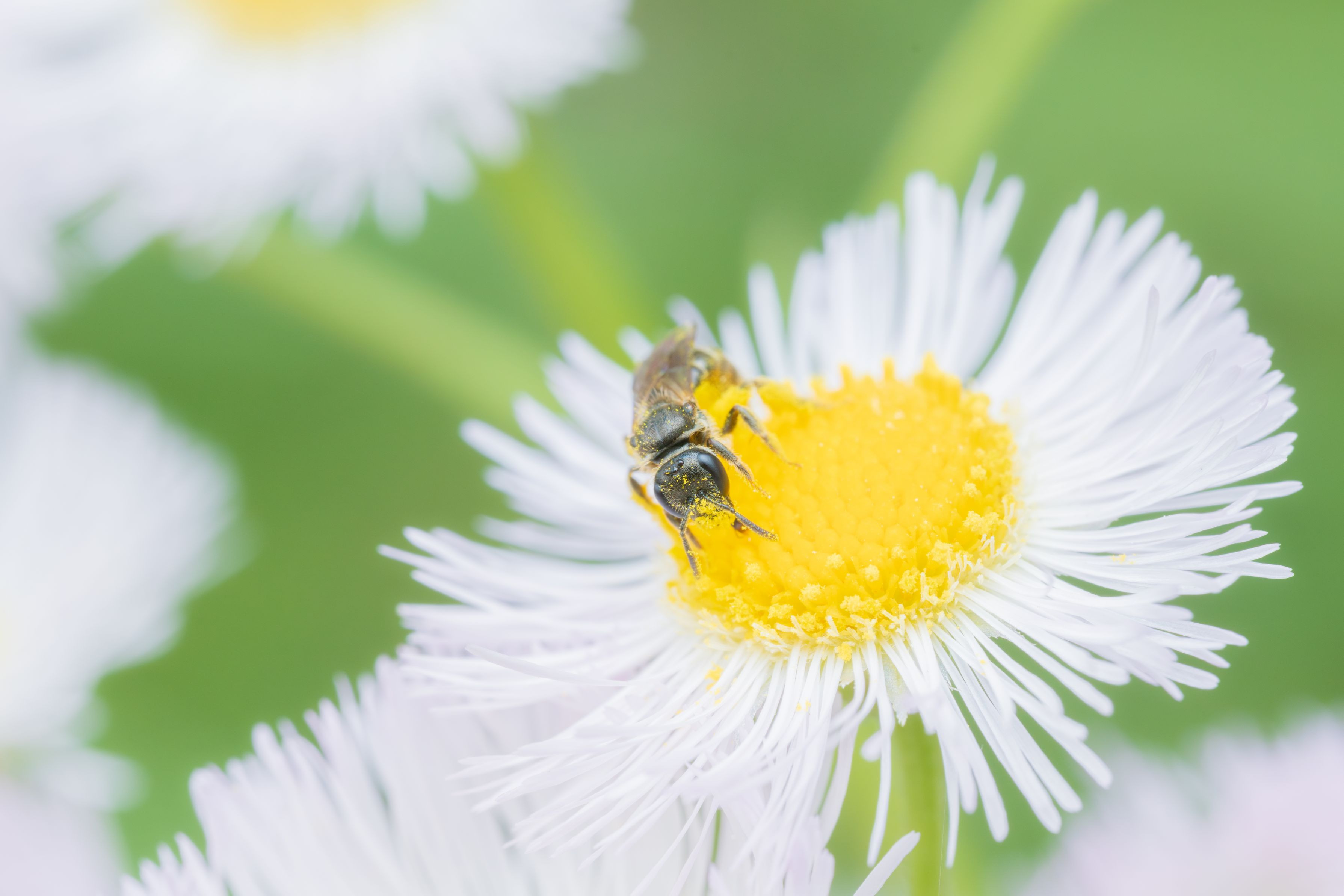 雑草も庭の賑わい。ハルジオン(雑草)の咲き乱れる我が家の庭に集まってくるミツバチ。