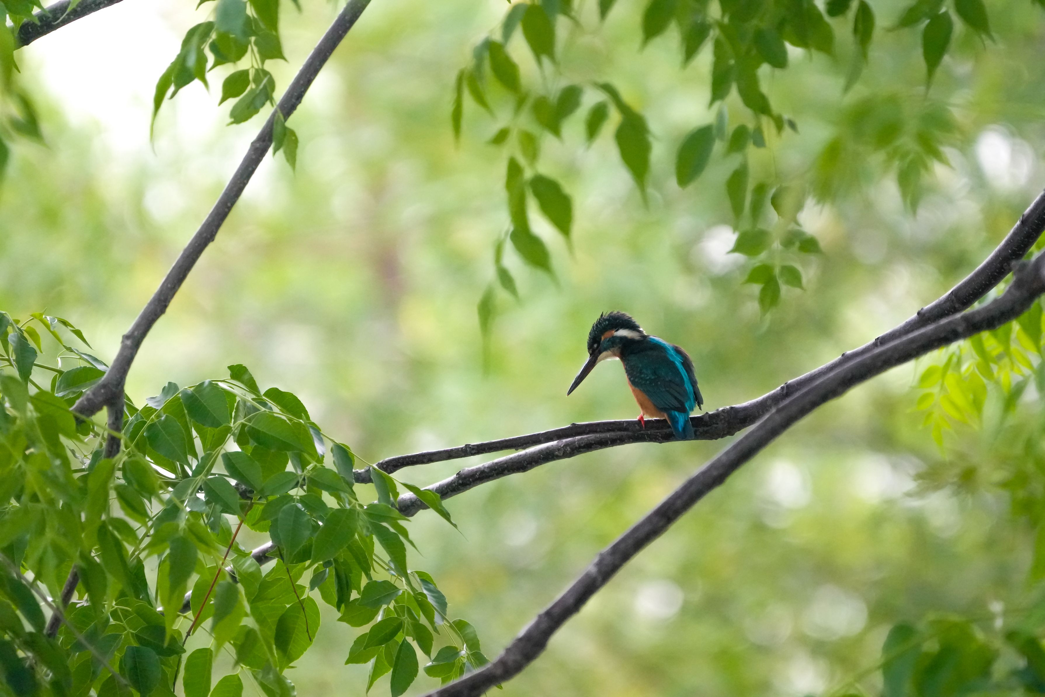 背景はグリーンの中で枝にとまって下を見下ろすカワセミさん、少し逆光ぎみでした!