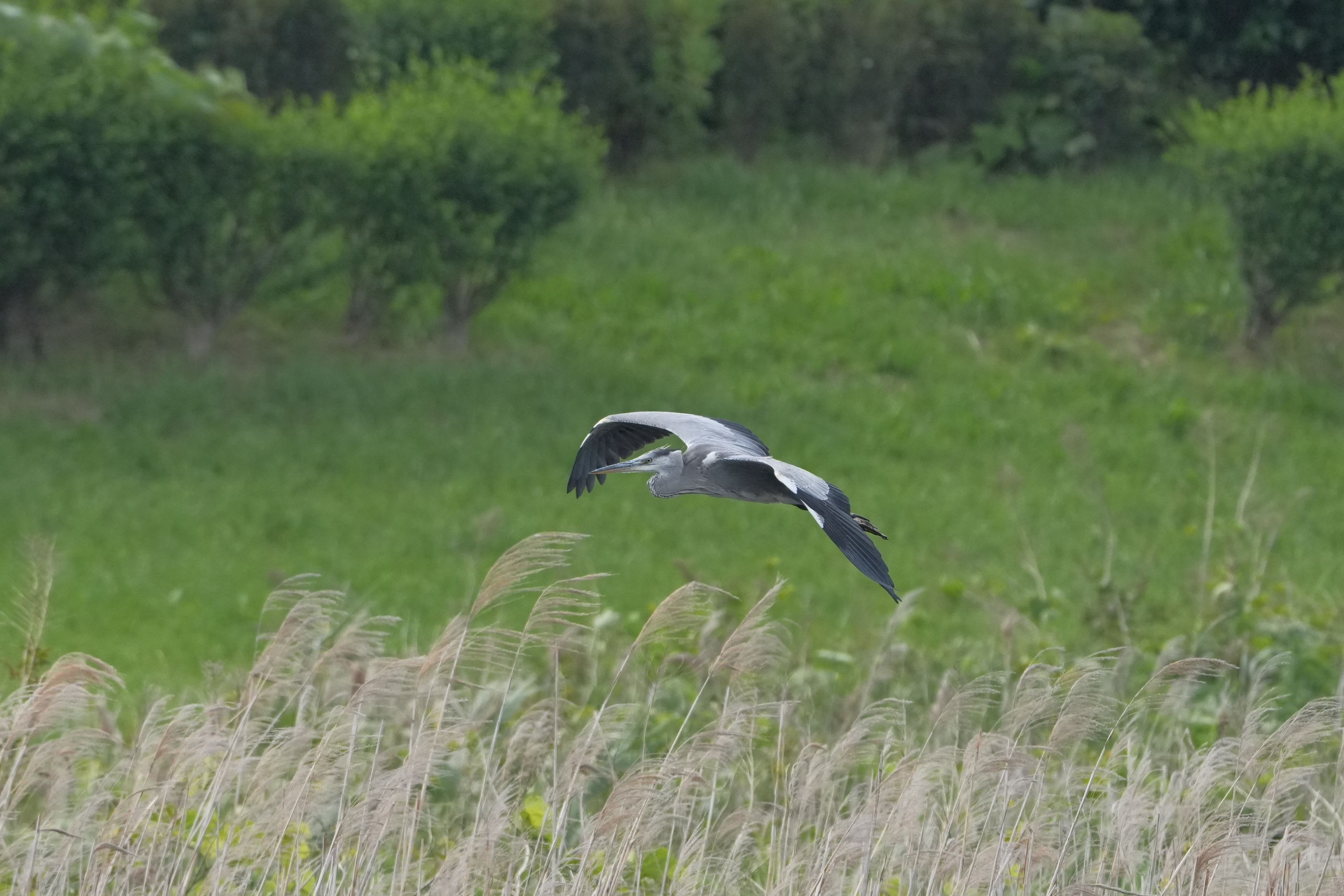 梅雨空の下、 さわやかな風が吹くように飛ぶアオサギさん。