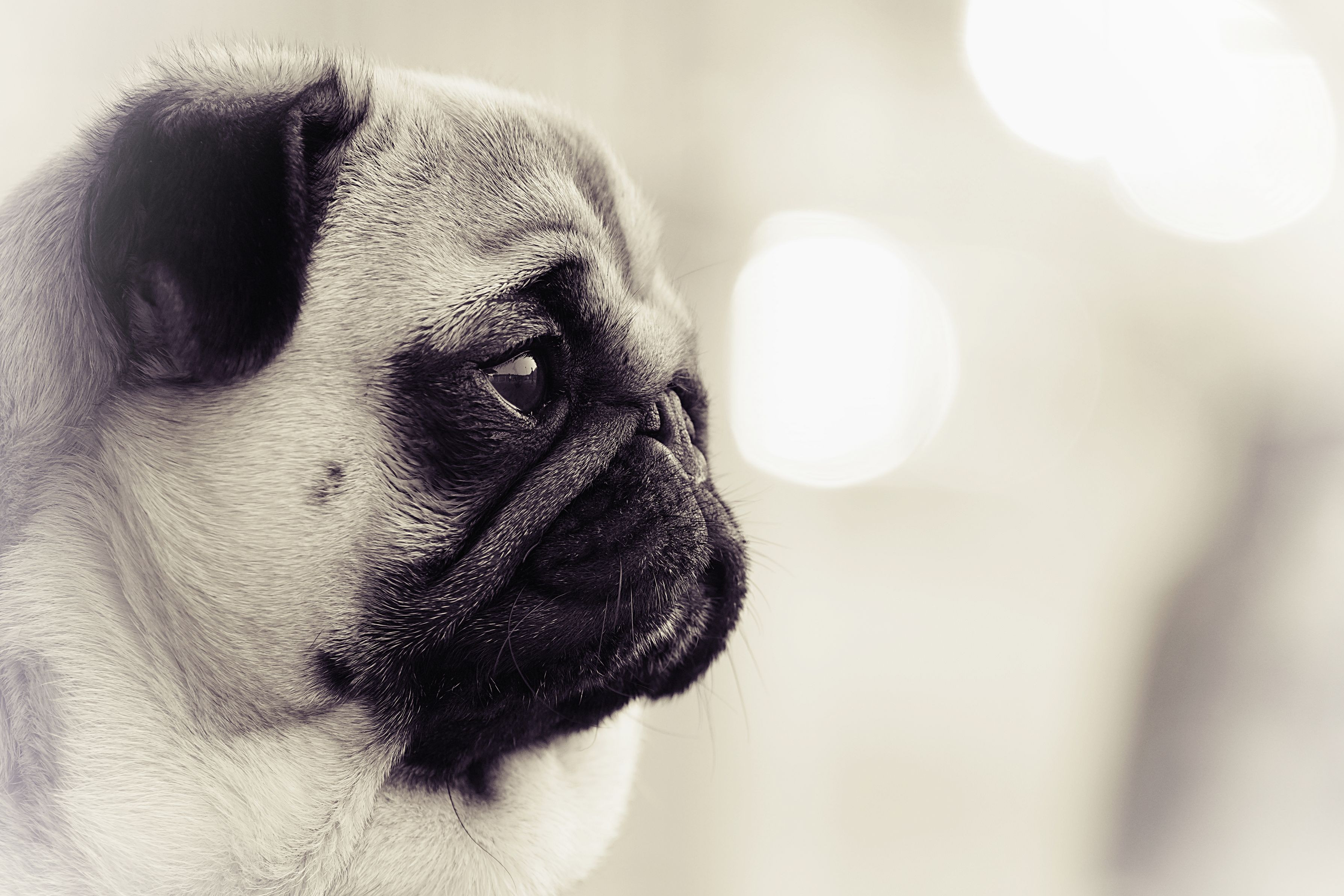 遠くを見つめるパグの横顔 モノクロ写真にしてみました。