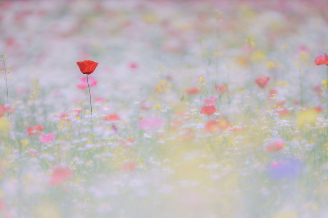 カスミソウやカモミールの雲に浮かんでいるようなポピーです