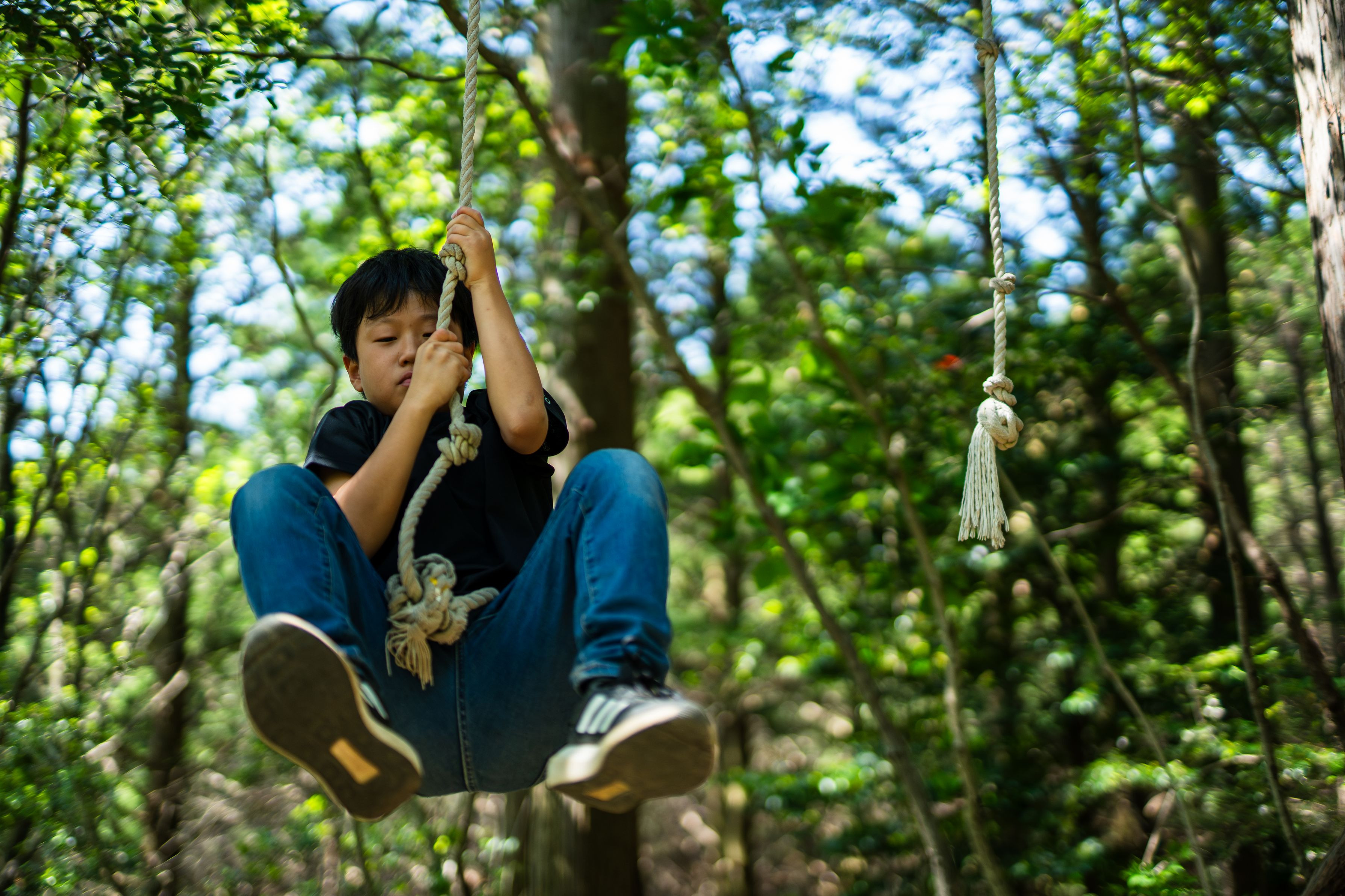 ロープにしっかり掴まって、まるで木の間を飛ぶ冒険者のよう。躍動感ある瞬間が、子どもの無邪気な好奇心を感じさせます。