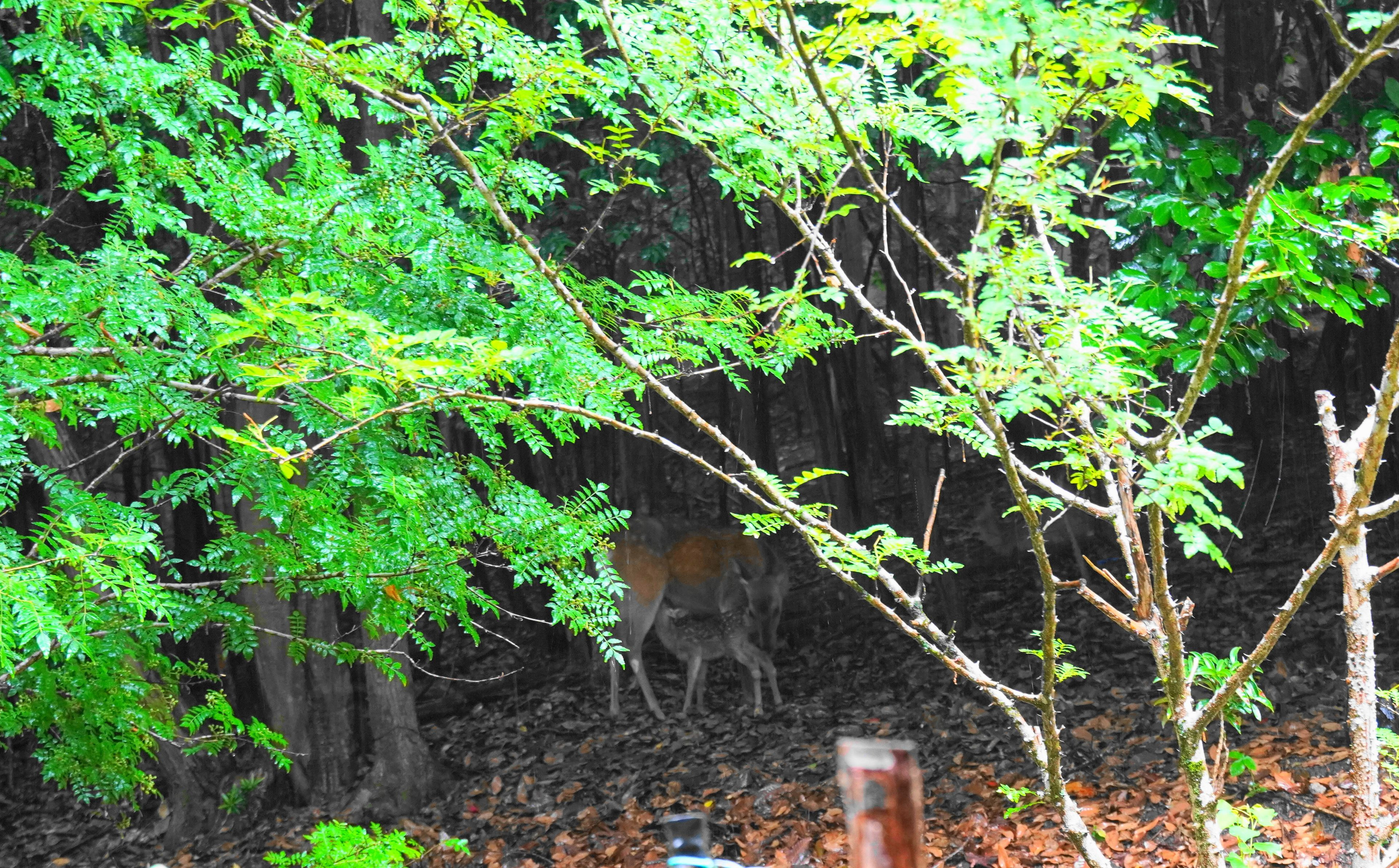 昨日、裏山に可愛い訪問者が。 生まれたばかりの子鹿が乳を飲んでいます。 親鹿は警戒してか、ズーとこちらを見ています。