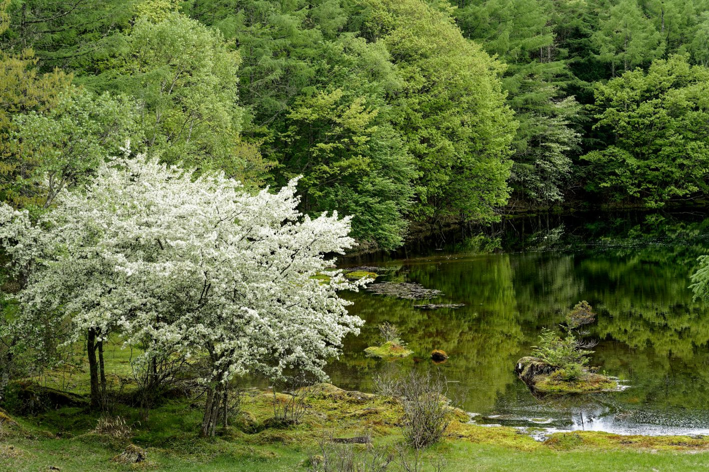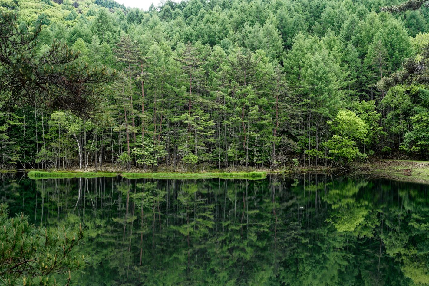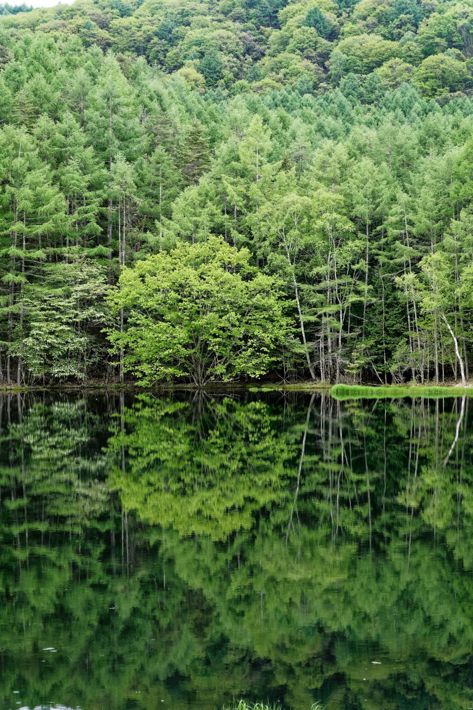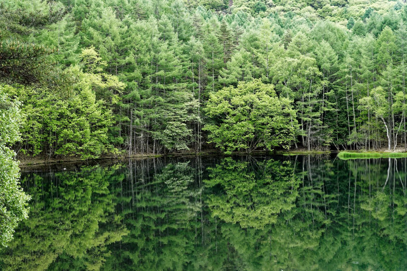 新緑に包まれた御射鹿池 白馬が現れそうなほどの水鏡の美しさでしたが、小雨が降り始め、あっという間に水鏡も消えてしまいました。