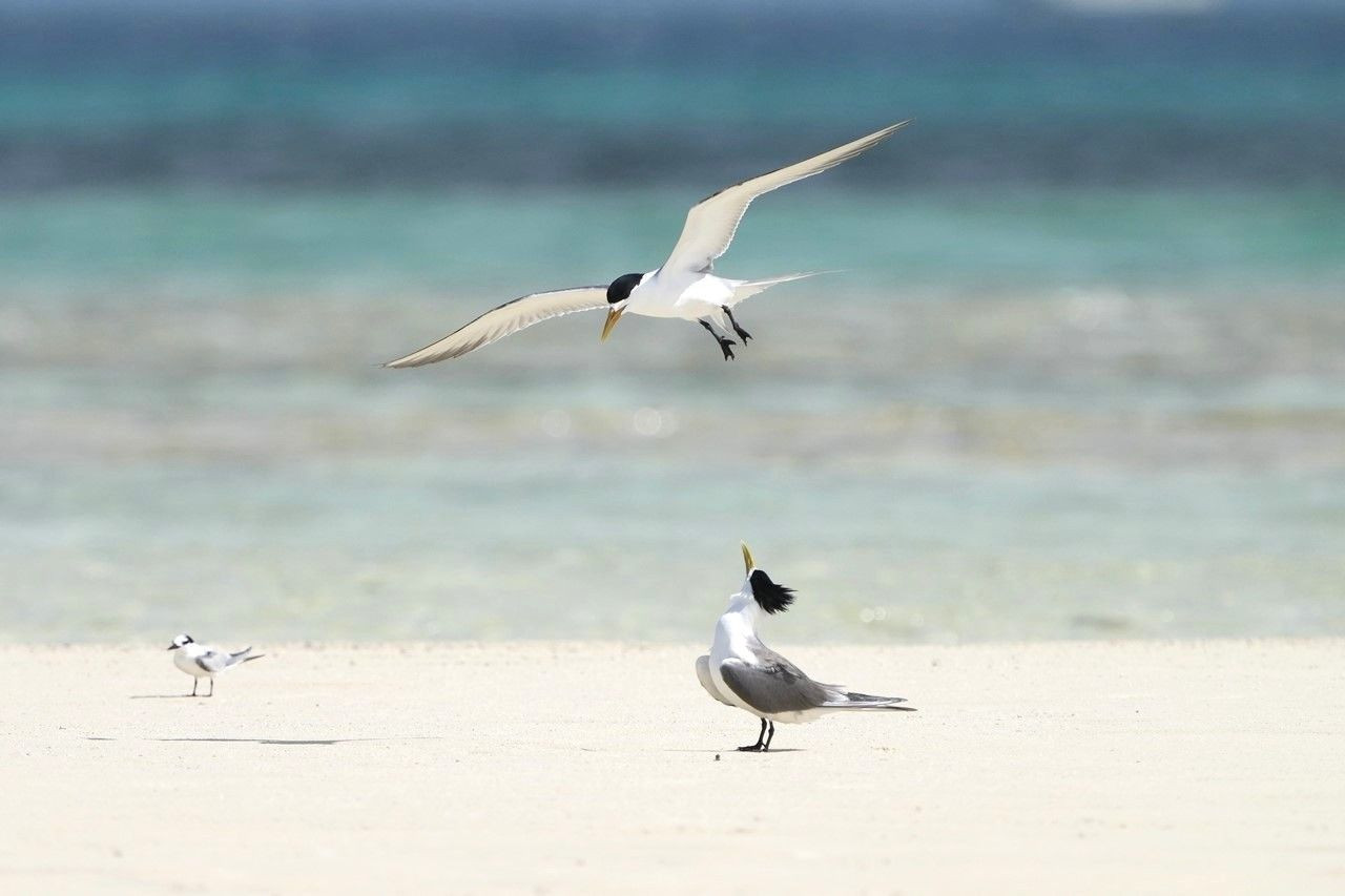 オオアジサシ 名前のとおり大きいですね。隣のエリグロアジサシが遠いせいもありますが小さく見えます。